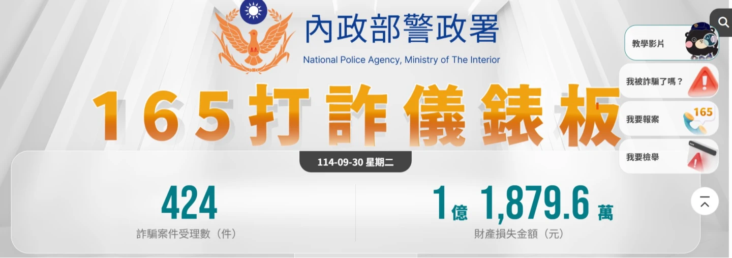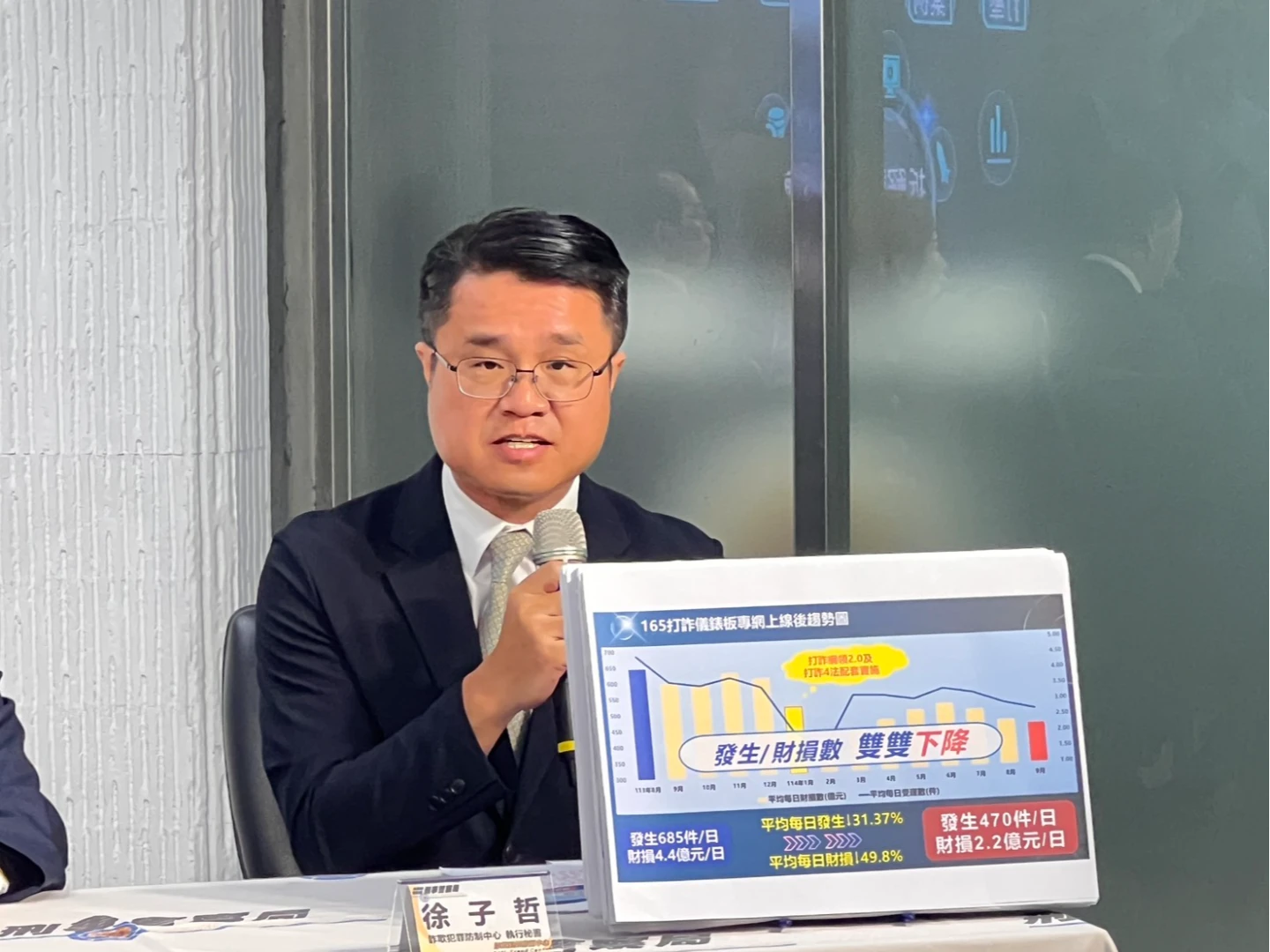 依據刑事局的「165打詐儀錶板」最新統計,今年9月全國平均每日受理詐騙案件470件、財損新臺幣2億2392多萬元,較去年同期(601件、3億9680多萬元)分別下降22%與44%。