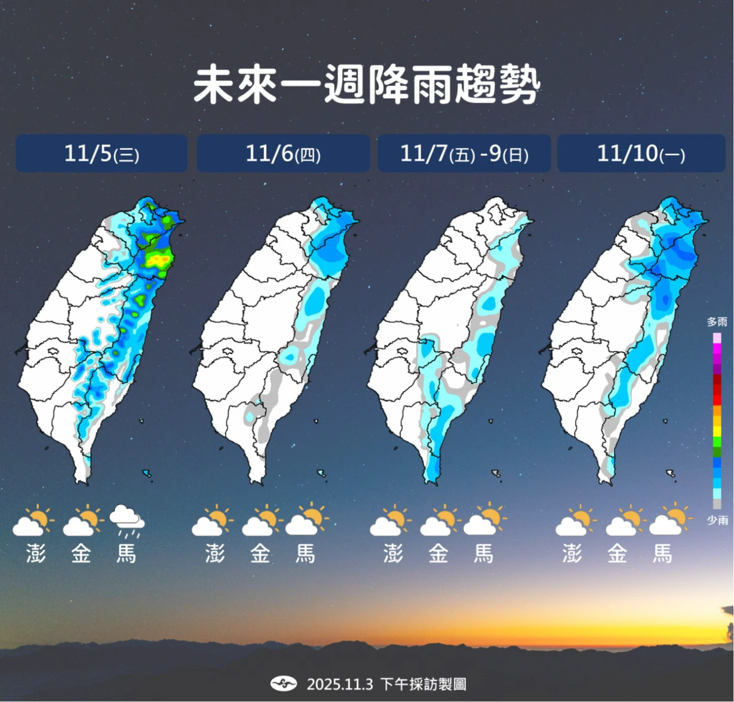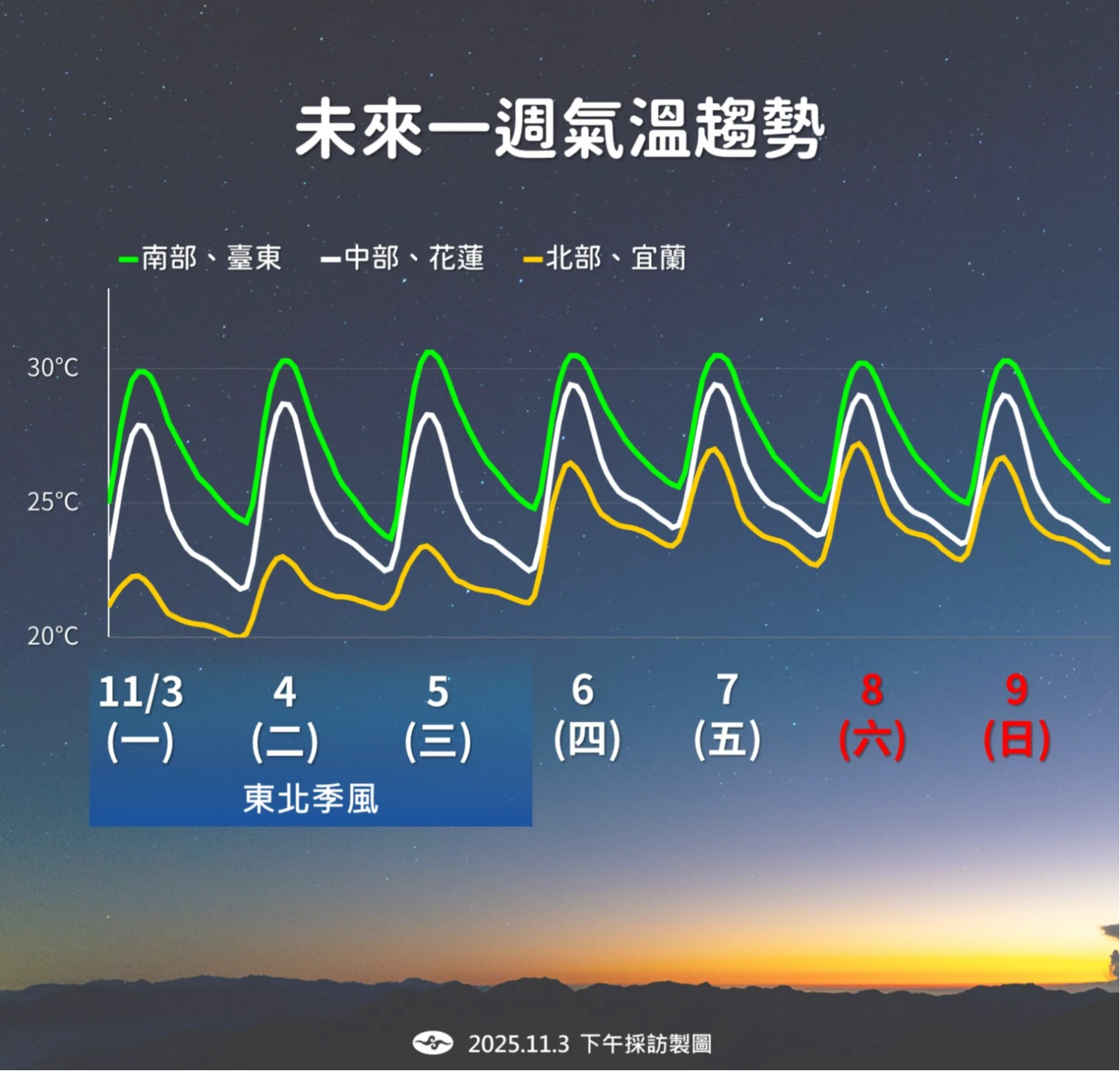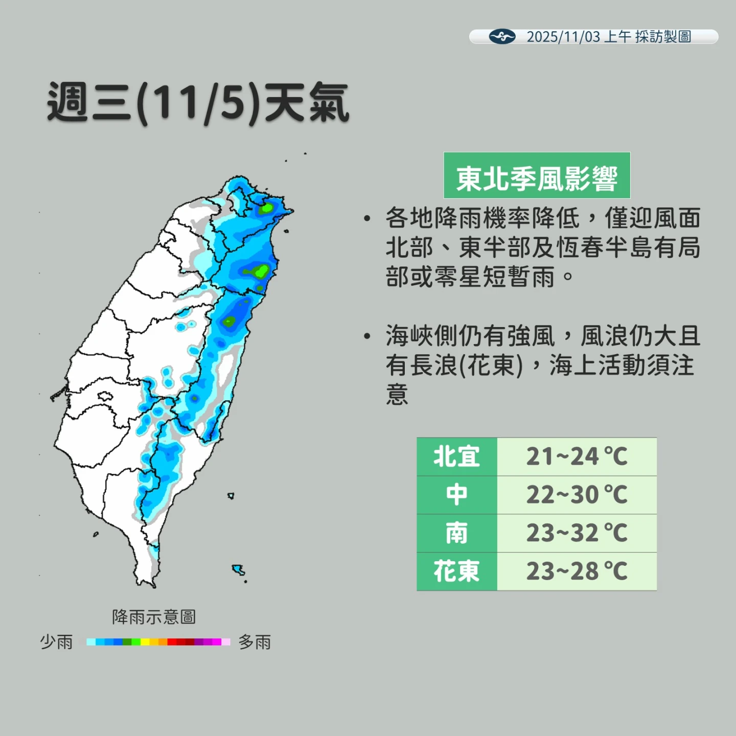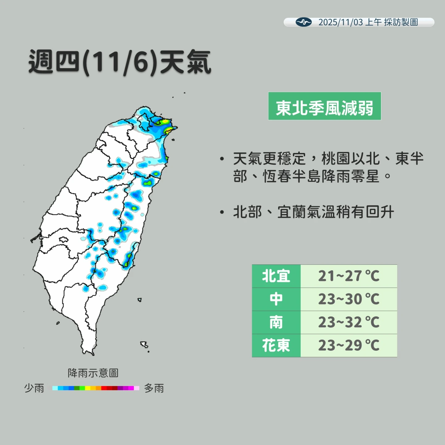 氣象署說,北台及宜蘭濕涼天氣持續到明天,周四(6日)起東北季風減弱,氣溫回升、降雨減少,北部與宜蘭白天轉暖。周五至周日(7~9日),全台多為多雲到晴,僅基隆北海岸、大台北山區及東半部偶有短暫雨,午後中南部山區有零星陣雨,北部與東半部高溫27~29°C。