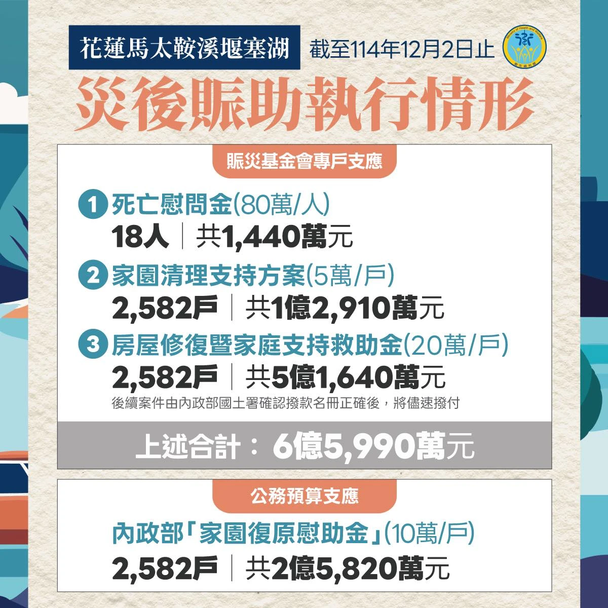 【記者賴昀岫/台北報導】衛生福利部公布「花蓮馬太鞍溪堰塞湖」專案,最新災後賑助執行情形,截至12月2日,中央家園清理支持慰助金累計已撥付超過9億元,將持續發放。其中每名罹難者80萬的死亡慰問金,目前已發給18名罹難者家屬,另有1人的撥款程序尚在進行中,預計本周完成撥款。