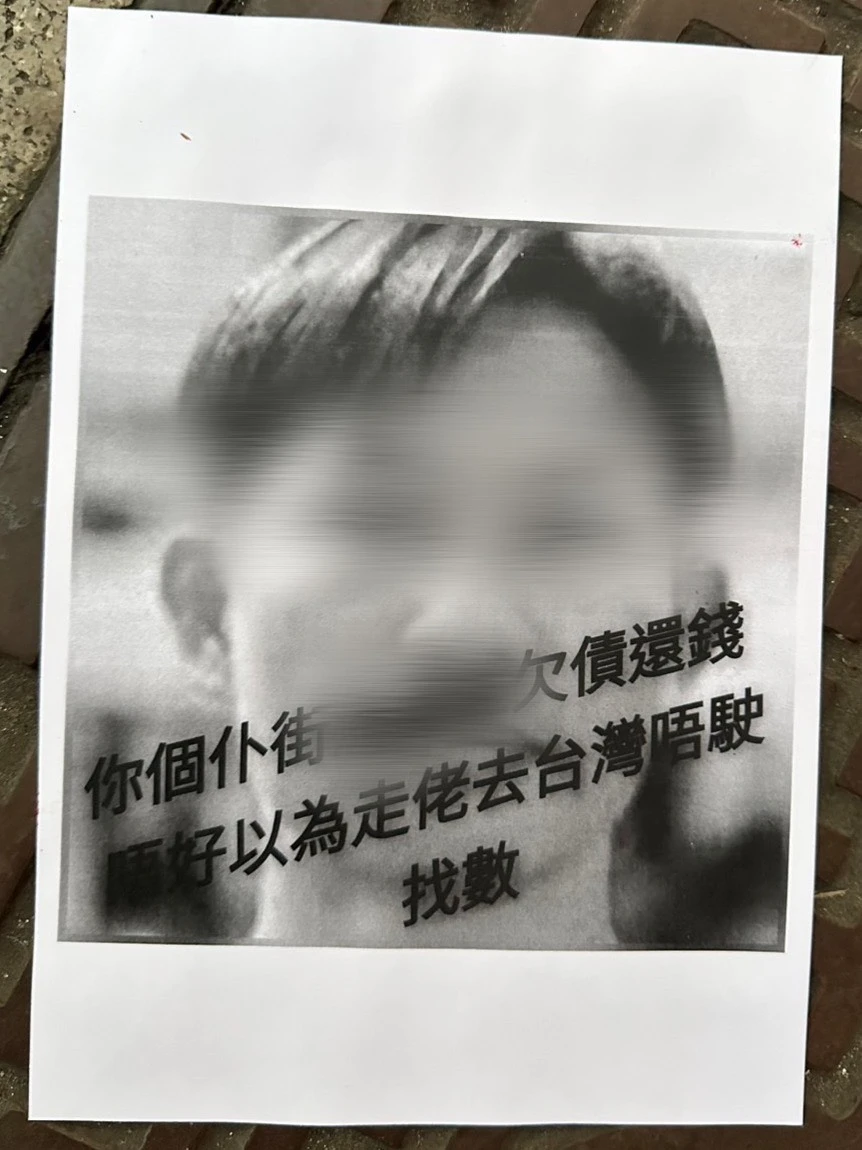 據了解,今天凌晨2時許,梁男潑灑紅漆後,還在現場丟印有湯男頭像的傳單,寫著「你個仆街,欠債還錢。唔好以為走佬去台灣唔駛找數。」意思略為「你這混蛋,欠債還錢。別以為逃跑去台灣就不用還錢」。