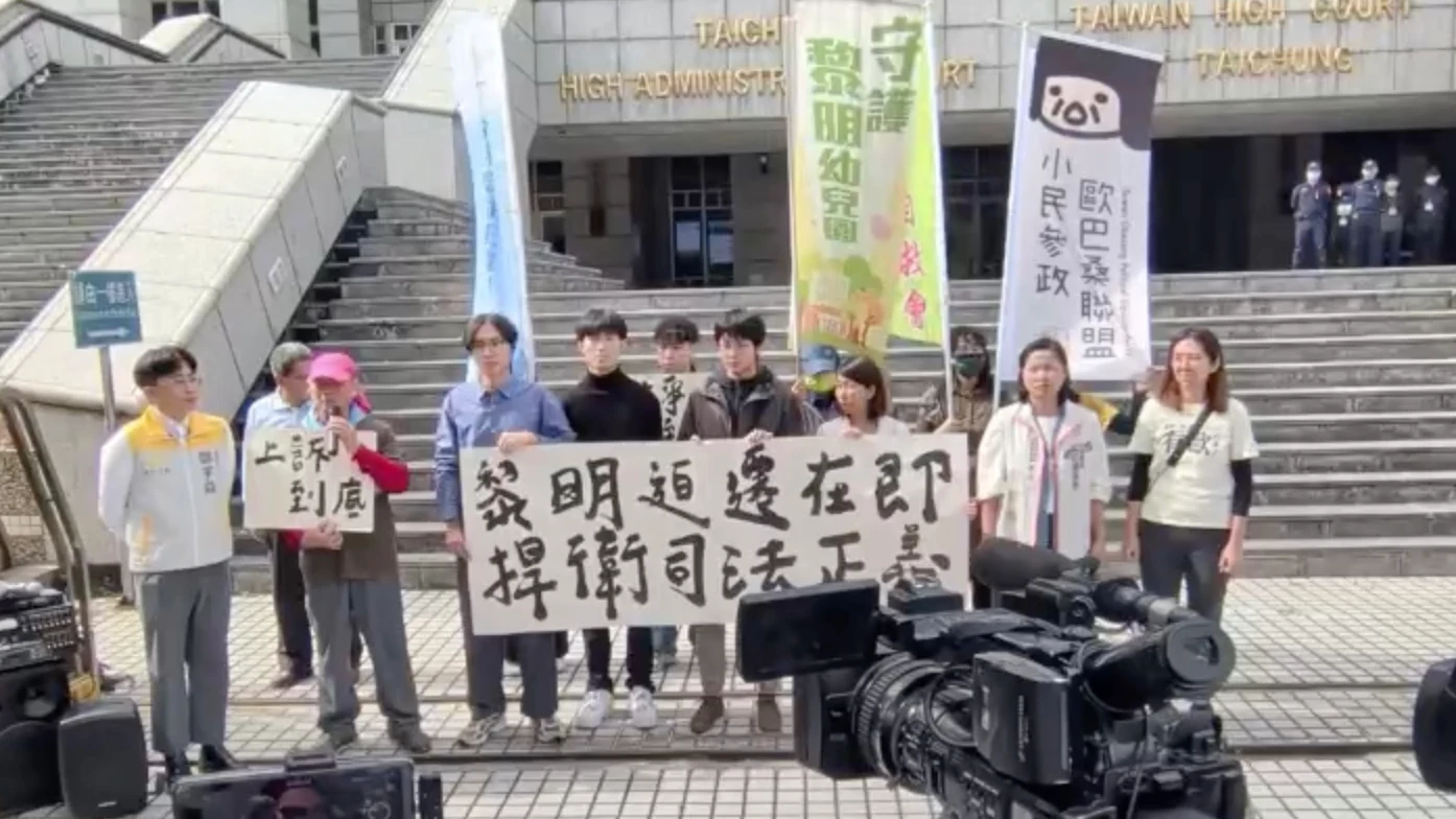 林金連與聲援團體上午齊聚在台中高分院外,對判決結果表達強烈不滿,認為判決不利於弱勢土地權利保障,痛批「不是黎明幼兒園的敗訴,而是全台灣人的敗訴」,呼籲制度性檢討,並揚言上訴到底。