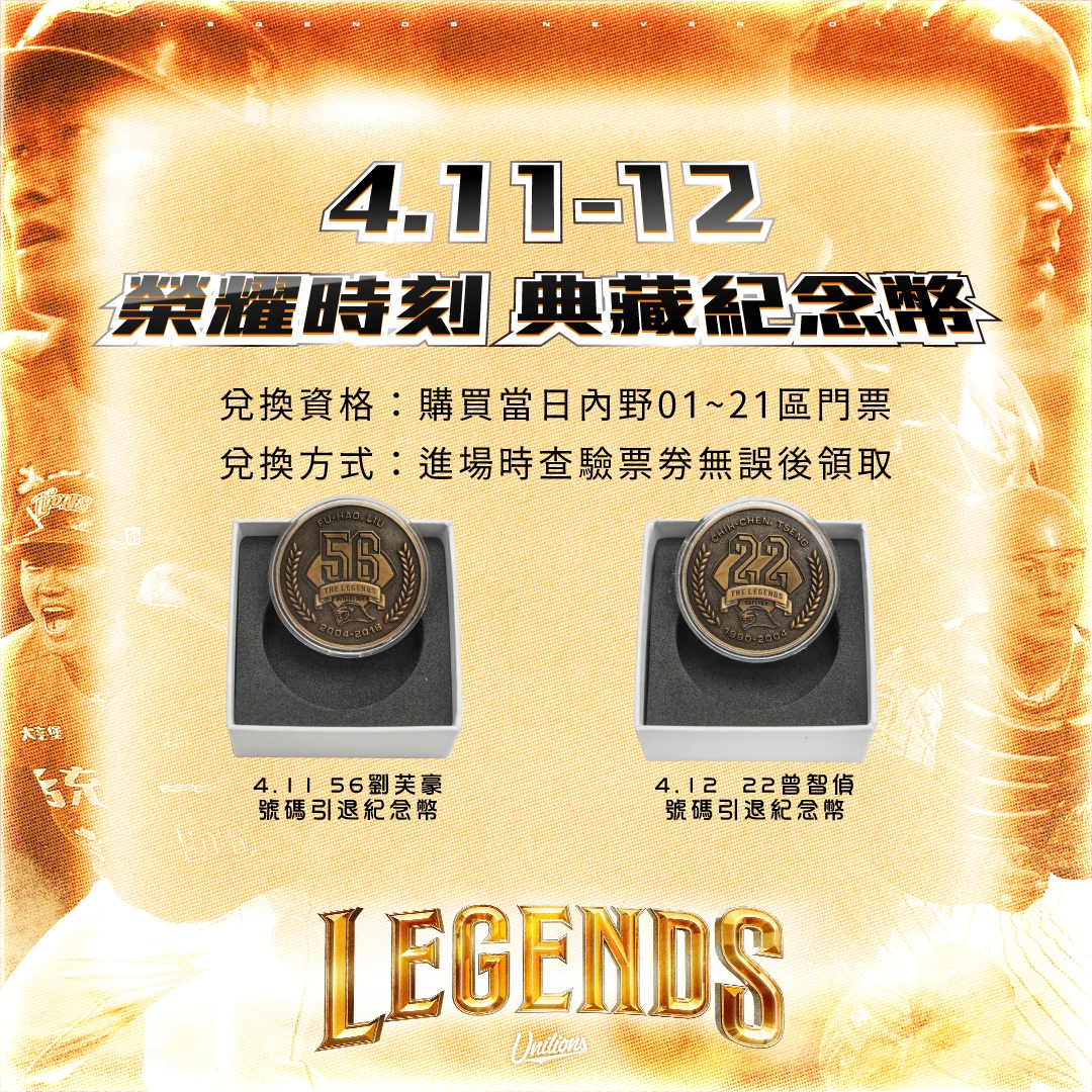 4月11日統一獅號碼引退活動以56劉芙豪為主軸,而4月12日統一獅號碼引退活動以22曾智偵延續,一個背號,承載一個時代,這一次特別為了答謝曾經一路支持的球迷們,連續兩天特別規劃「統一獅號碼引退紀念幣」、「號碼印退榮耀故事紀念報刊」,凡購買內野01~21區球迷朋友進場均可獲得各一份,其中4月11日紀念幣推出56劉芙豪款式;4月12日紀念幣推出22曾智偵款式,當天兩位選手也將親自出席號碼引退儀式,無論你是那一個世代的球迷,讓我們一起進場見證統一獅隊史榮耀時刻,對於獅隊而言號碼引退是一個榮耀時刻里程碑,連續兩天也會在亞太成棒棒球場內野、外野規劃紀念戳章,歡迎大家一起進場來蓋印收藏。