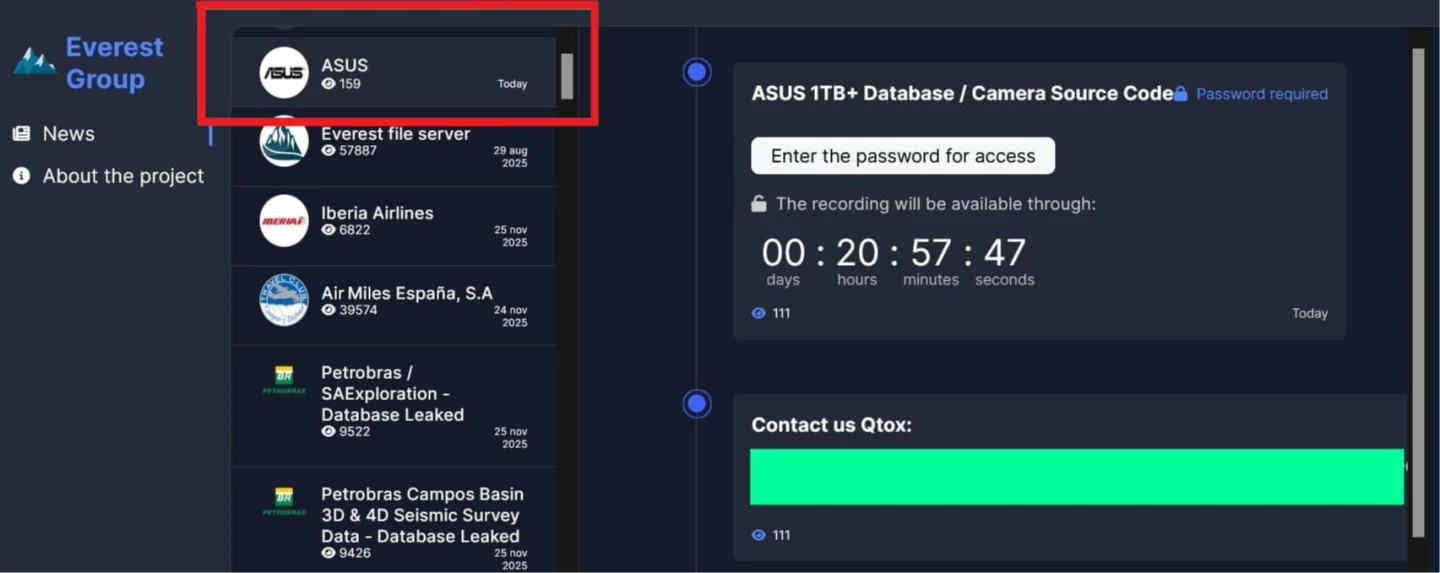 據《HackRead》報導,Everest 2日在暗網的外洩網站上發布聲明,指稱被竊資料包含華碩裝置中與相機相關的專有韌體或軟體。他們並要求華碩在21小時內透過加密訊息平台Qtox與其聯繫,也就是昨(3日)深夜11時之前。