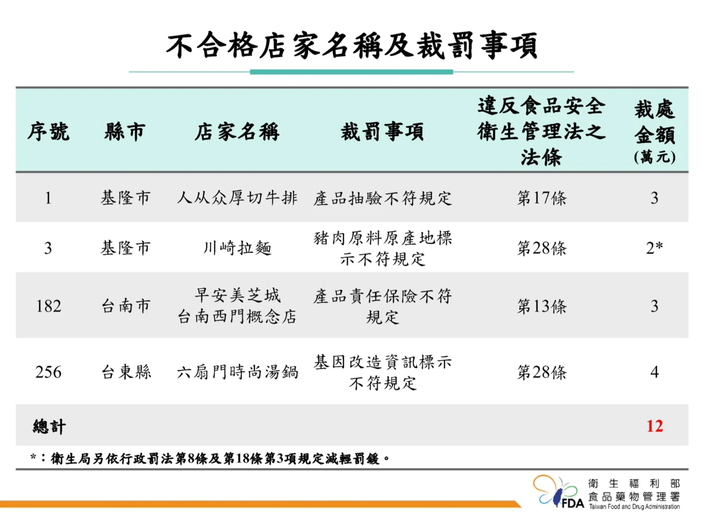 2家標示不符規定的業者,分別為基隆市川崎拉麵,以及台東縣六扇門時尚湯鍋。劉芳銘說,前者的豬肉原料原產地標示不實,違反食品安全衛生管理法第28條,基於業者為初犯或財力不足等原因,依同法第45條及行政罰法第8條暨第18條規定裁處2萬元;後者因玉米筍基因改造資訊標示不符,依同法開罰4萬元。