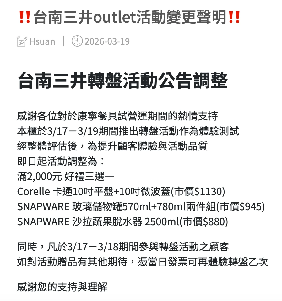 面對文章發酵延燒,康寧餐具今天在官網發出聲明,先是感謝試營運期間的熱情支持,並解釋3月17日至19日推出轉盤活動作為「體驗測試」,經整體評估後,為提升顧客體驗與活動品質,即日起調整為好禮三選一。