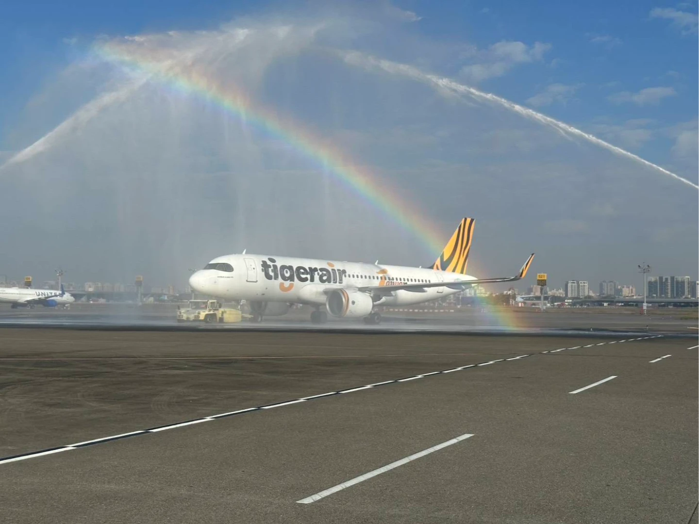 在台南市長黃偉哲、立法委員林俊憲、陳亭妃、民航局長何淑萍與台灣虎航商務長許致遠共同見證下,台虎今天首航台南—熊本航線;不遠處,台虎高雄—熊本也在今天首航,站方特別準備「水門禮」慶賀,台灣虎航董事長黃世惠與立法委員許智傑也陪著旅客搭乘首航班機前往熊本。