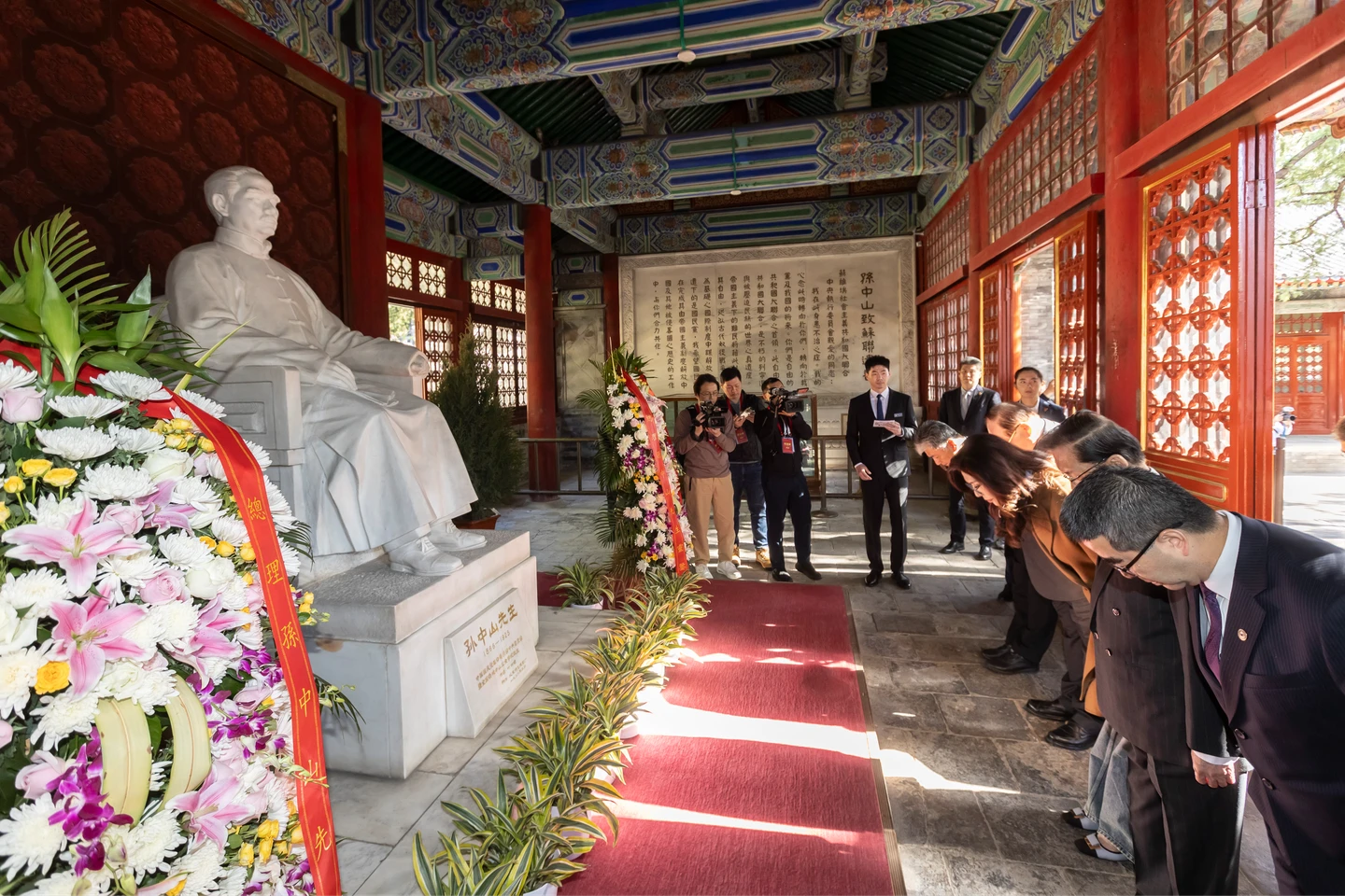鄭麗文繼昨天鄭習會後,今率團員到北京西郊香山碧雲寺,一行人先在寺內的孫中山紀念堂,對孫的全身塑像行三鞠躬禮,鄭凝視紀念堂壁上鐫刻的《孫中山先生致蘇聯遺書》和中山先生蓋棺、遺墨、遺著等文物。