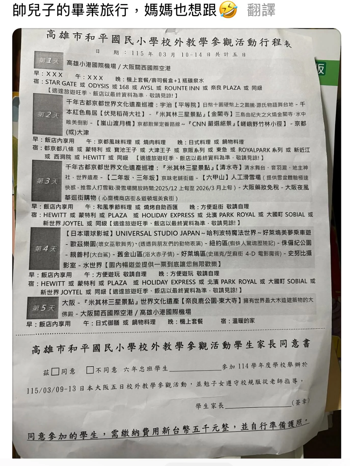 有家長在社群平台Threads貼出高雄和平國小畢旅行程表,笑說「帥兒子的畢業旅行,媽媽也想跟」。這趟5天4夜的日本行,行程涵蓋大阪、京都、奈良等經典景點,包含平等院、伏見稻荷大社、清水寺以及最讓孩子們興奮的環球影城,團費只要5千元,引發網友熱烈討論。
