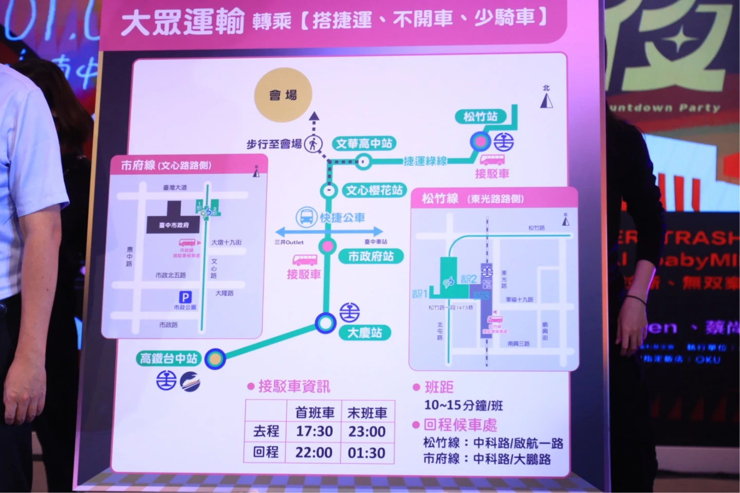 市府同時規劃兩條免費接駁路線,包括「市政府線」及「松竹線」,跨年晚會當天下午5點30分起發車,人滿即發;散場接駁時間為晚間10點至翌日凌晨1點30分,班距約10至15分鐘一班,跨年夜捷運也將加密班次並延長營運至凌晨2點,協助民眾順利返程。