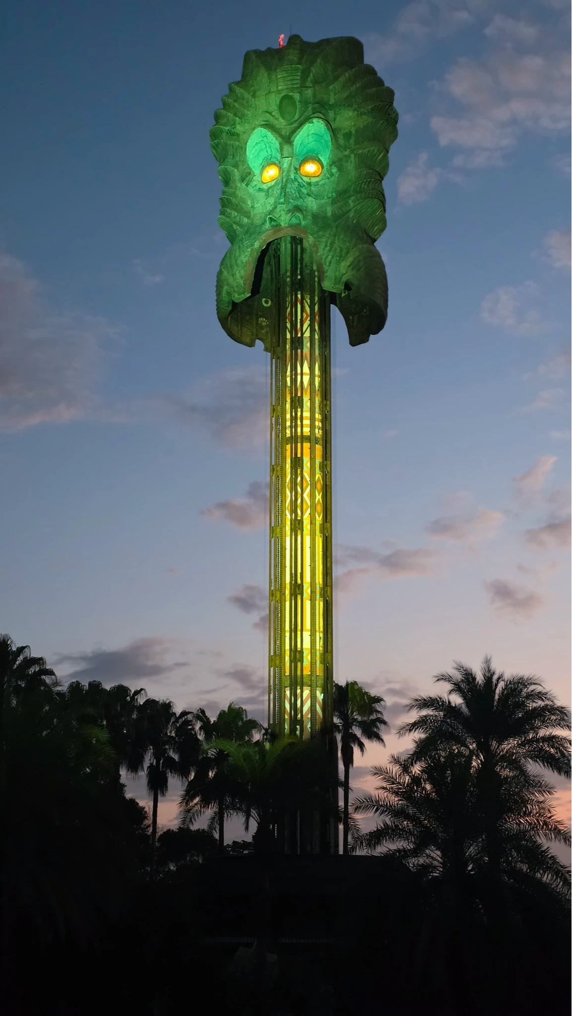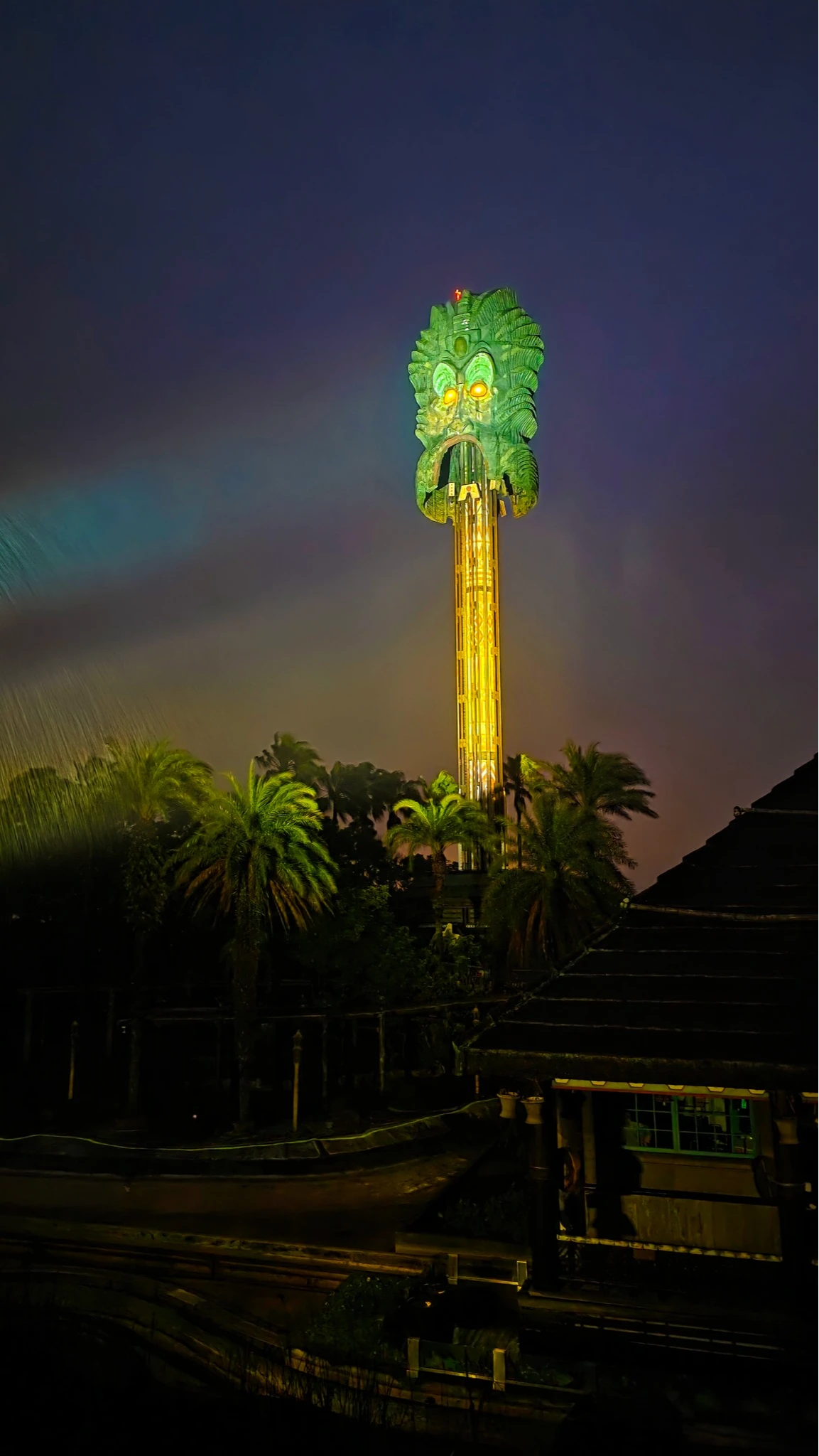 六福村粉專今天貼出「大怒神」畫面,感性地表示,後勤團隊特別為即將換臉的大怒神打上燈光,在風雨中,那彩色的光芒顯得格外溫柔,像是在跟大家道別。