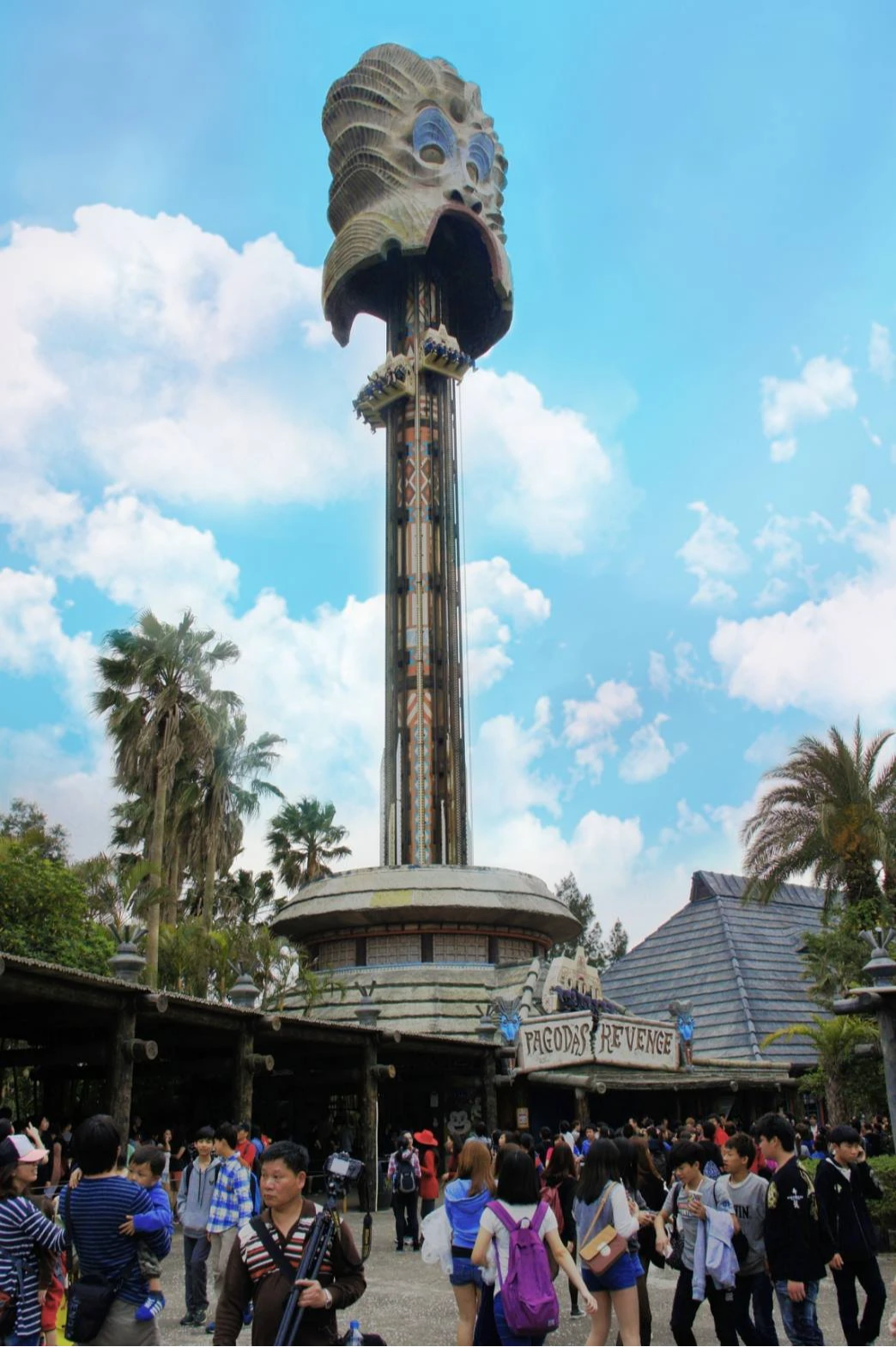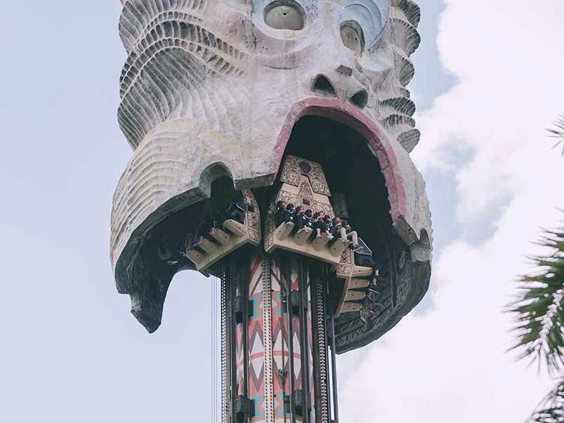「大怒神」是超速自由落體,搭乘著座椅緩緩上升至最高點時,遊客將隱身大怒神憤怒的面容中,接著座椅將以自由落體的G速度向下墬落,幾秒中就從53公尺(17層樓高)降至地面,在頭皮發麻下體驗地心引力的威力。