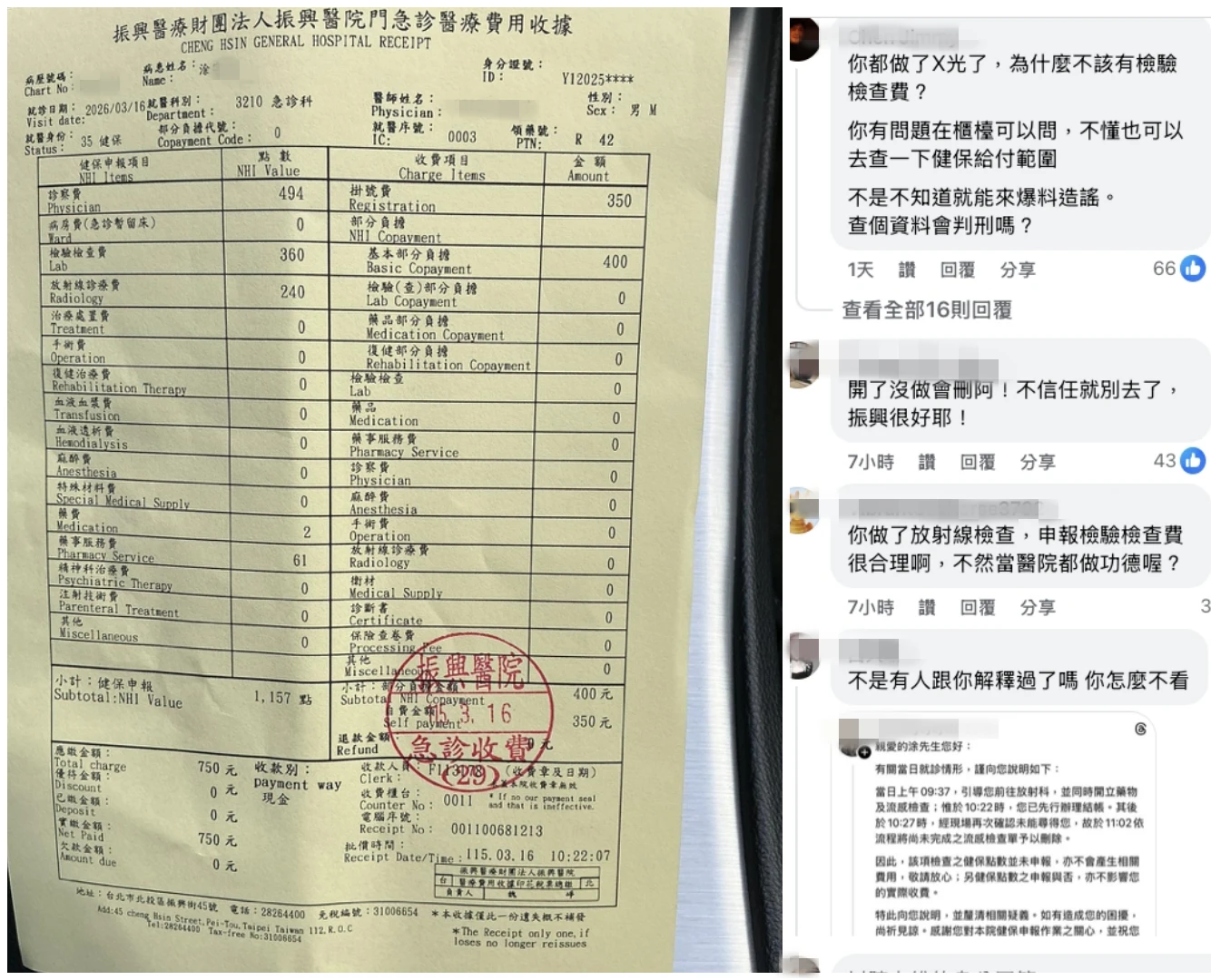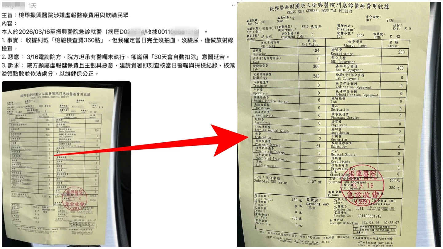 涂姓男子在社群Threads發文,主旨大剌剌寫著「檢舉振興醫院涉嫌虛報醫療費用與欺瞞民眾」,附上醫療收據指稱,他在3/16至振興醫院急診就醫,指控收據上列載了「檢驗檢查費360點」,他宣稱,十分確定自己當天完全沒有抽血、沒驗尿,僅做了放射線檢查。涂男更批評,他事後致電詢問,指院方坦承醫囑未執行,卻謊稱「30天會自動扣除」是意圖延宕,訴求健保署即刻查核並核減溢領點數。