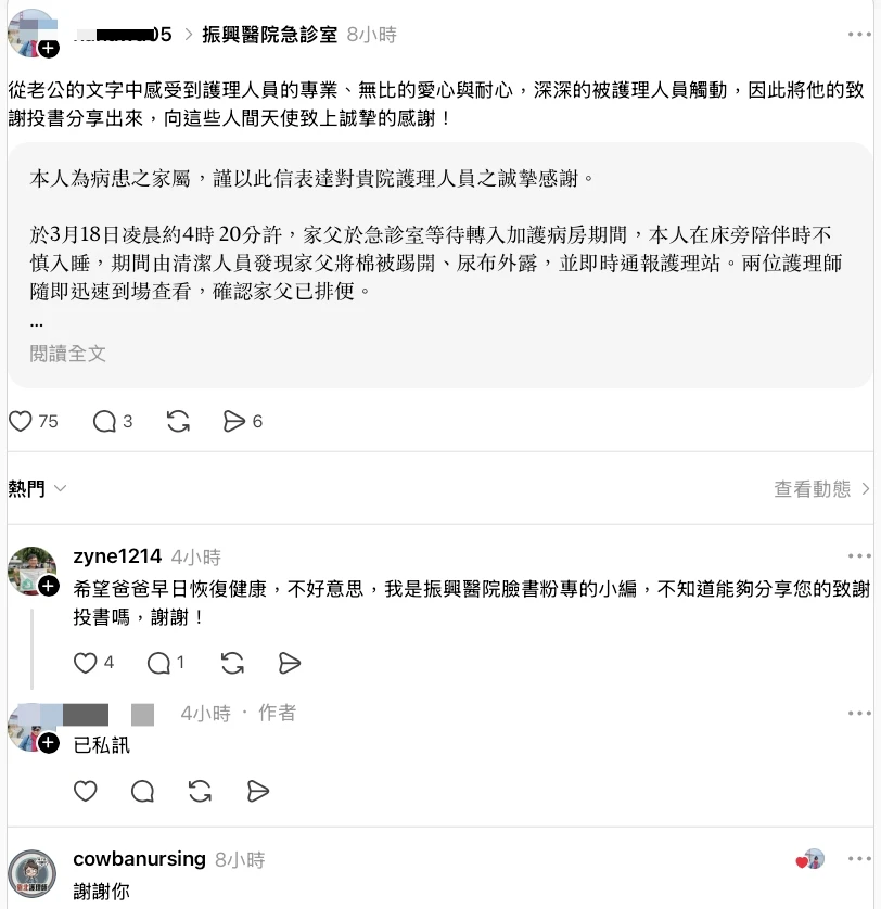 與奧客無理公審形成鮮明對比的,是振興醫院第一線醫護人員默默奉獻的溫暖事蹟。今(3/18)天一名病患家屬在Threads發文分享家人一封寫給振興醫院的致謝信。信中提到,老父在急診室等待轉加護病房期間,因排出水便導致排泄物溢出尿布、流至地面,甚至噴濺到兩位前來處理的護理師鞋面上。