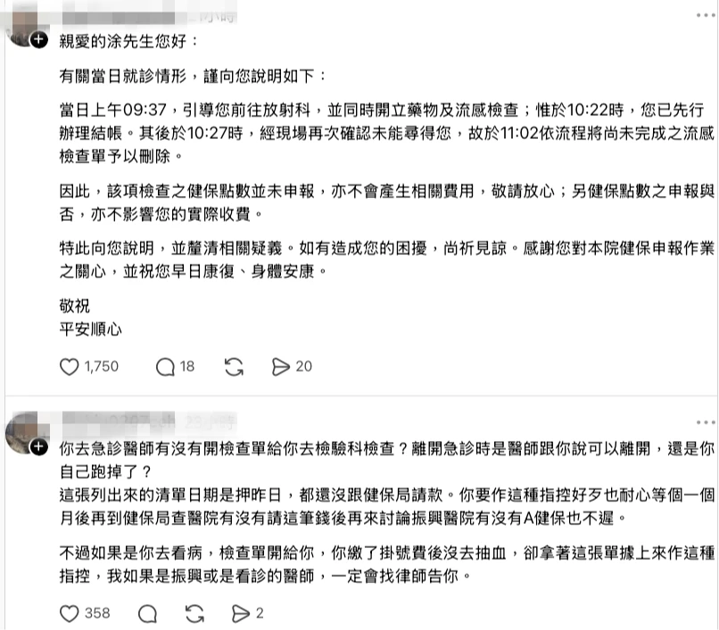 面對病患的嚴厲指控,振興醫院急診醫師現身涂姓男子文章下方留言,耐心且條理分明地還原了就診時序。醫師說明,當天上午09:37引導病患前往放射科,並同時開立了藥物及流感檢查;然而到了10:22時,病患已自行辦理結帳。院方於10:27現場再次確認找不到病患後,便於11:02依流程將尚未完成的流感檢查單予以刪除。