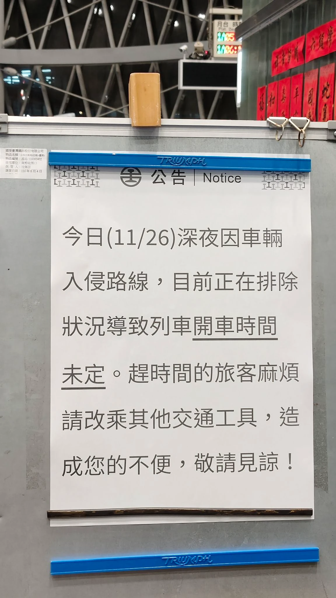 台鐵表示,受基隆站路線遭自小客車入侵路線事故影響,一度基隆=七堵間以西正線單線雙向行車,上、下行列車均有延誤。