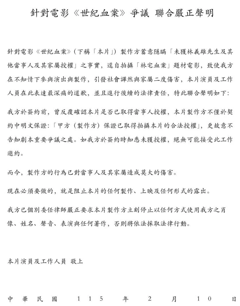 根據聲明內容,演員方痛批製作公司在拍攝前,曾多次口頭與書面保證已取得林義雄先生及其家屬的合法授權。聲明指出,製作方不僅在合約中明文保證「已取得拍攝本片之合法授權」,更惡意隱瞞劇本中具高度爭議之處,導致演員與工作人員在不知情的情況下參與演出,強調「如果簽約時知悉未獲授權,絕無可能接受此工作邀約」。