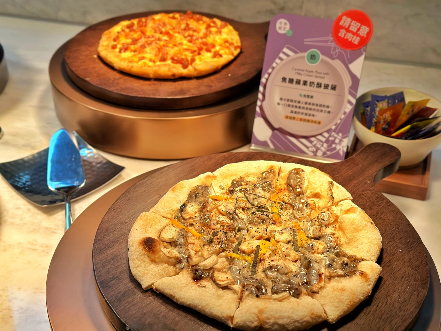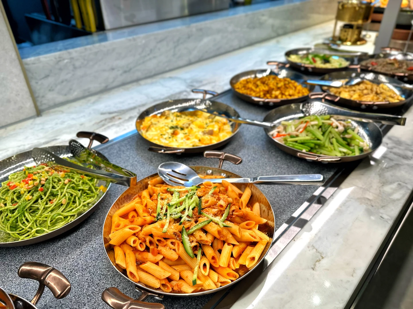 「熱食區」有義大利波隆那若醬麵、松子羅勒義大利麵、松露奶油野蕈燉飯、松露野菇披薩、焦糖蘋果奶酥披薩、酥皮巧達濃湯、歐姆蛋捲;「甜點區」更是豐富,多達近30種,包含香草泡芙、紅豆大福、經典生巧克力、鮮奶油波士頓派、焦糖布蕾、70%巧克力蛋糕、起士蛋糕等,以及10種冰淇淋,百香果雪酪、草苺雪酪、太妃奶茶、芝麻、巧克力等人氣口味通通有。