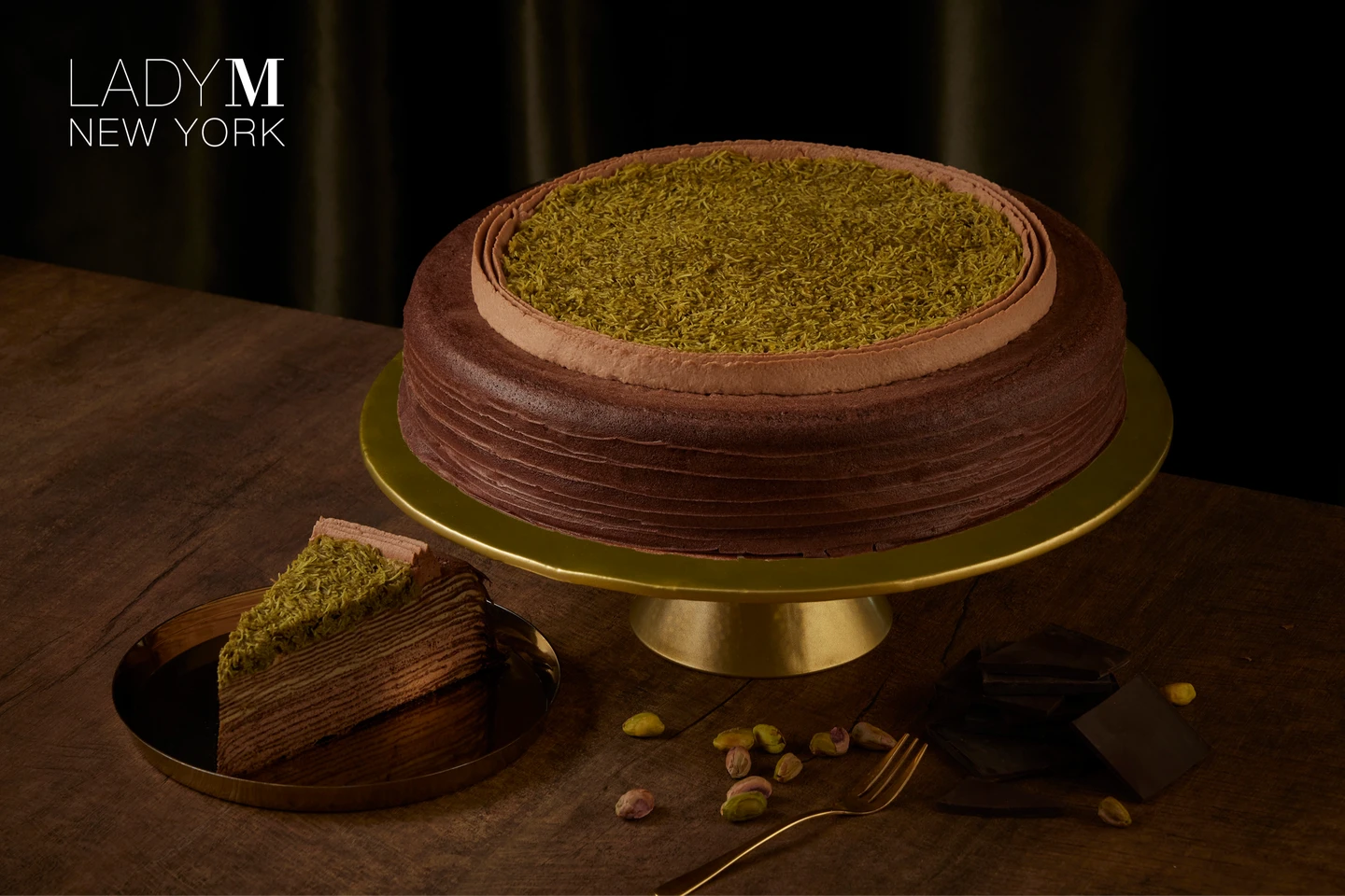 LADY M全新「杜拜巧克力千層」初登場,融合異國風情的杜拜巧克力千層蛋糕,內餡分別抹入醇厚的巧克力及開心果鮮奶油,頂層以烘烤過的 Kataifi(小麥脆麵)拌入開心果醬、中東白芝麻醬與白巧克力,打造出獨特的中東風格甜點。杜拜巧克力千層蛋糕單片300元、九吋3,000元。全台6間門市同步現場販售;官網開放台北旗艦&台北晶華店預購取貨。