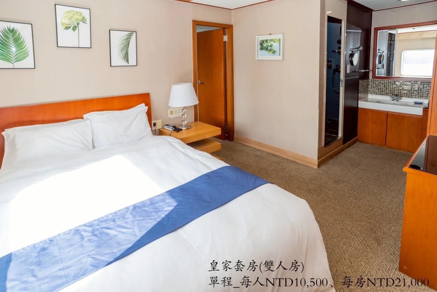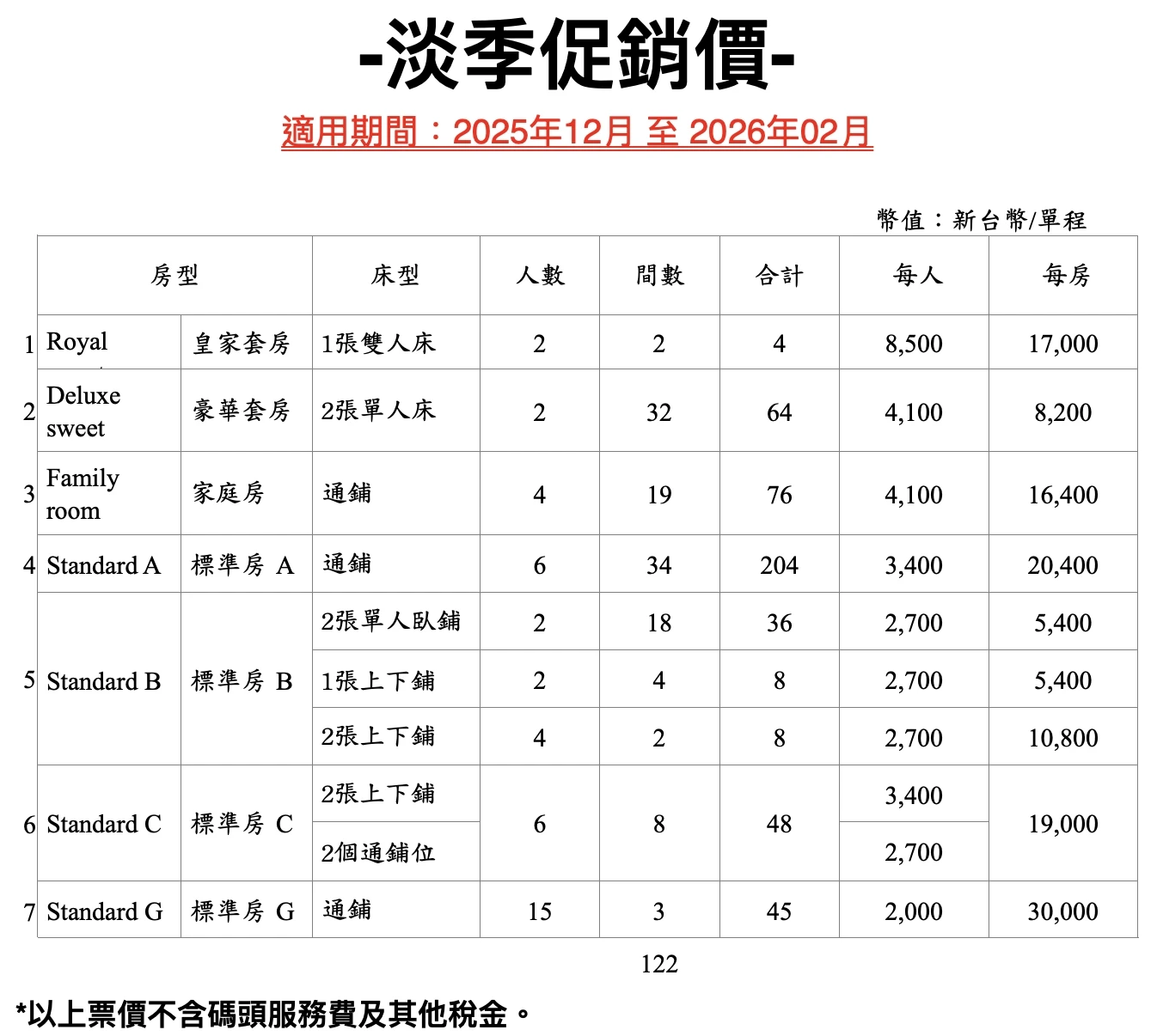華岡集團日前公佈各艙房,分為內艙、外艙,其中外艙全可眺望海景,今(26)日再公布淡季促銷票(單程),適用期間至明年2月。包含標準房(通鋪)共3間、一間可容納15人,每人2000元起,並將規劃女性專區;4人家庭房通鋪,共19間,每人4100元;豪華套房(2張單人床)共32間,每人4100元;皇家套房擁有1張雙人床及獨立寬敞客廳,全船僅2間,每人8500元。以上票價不含碼頭服務費及其他稅金。