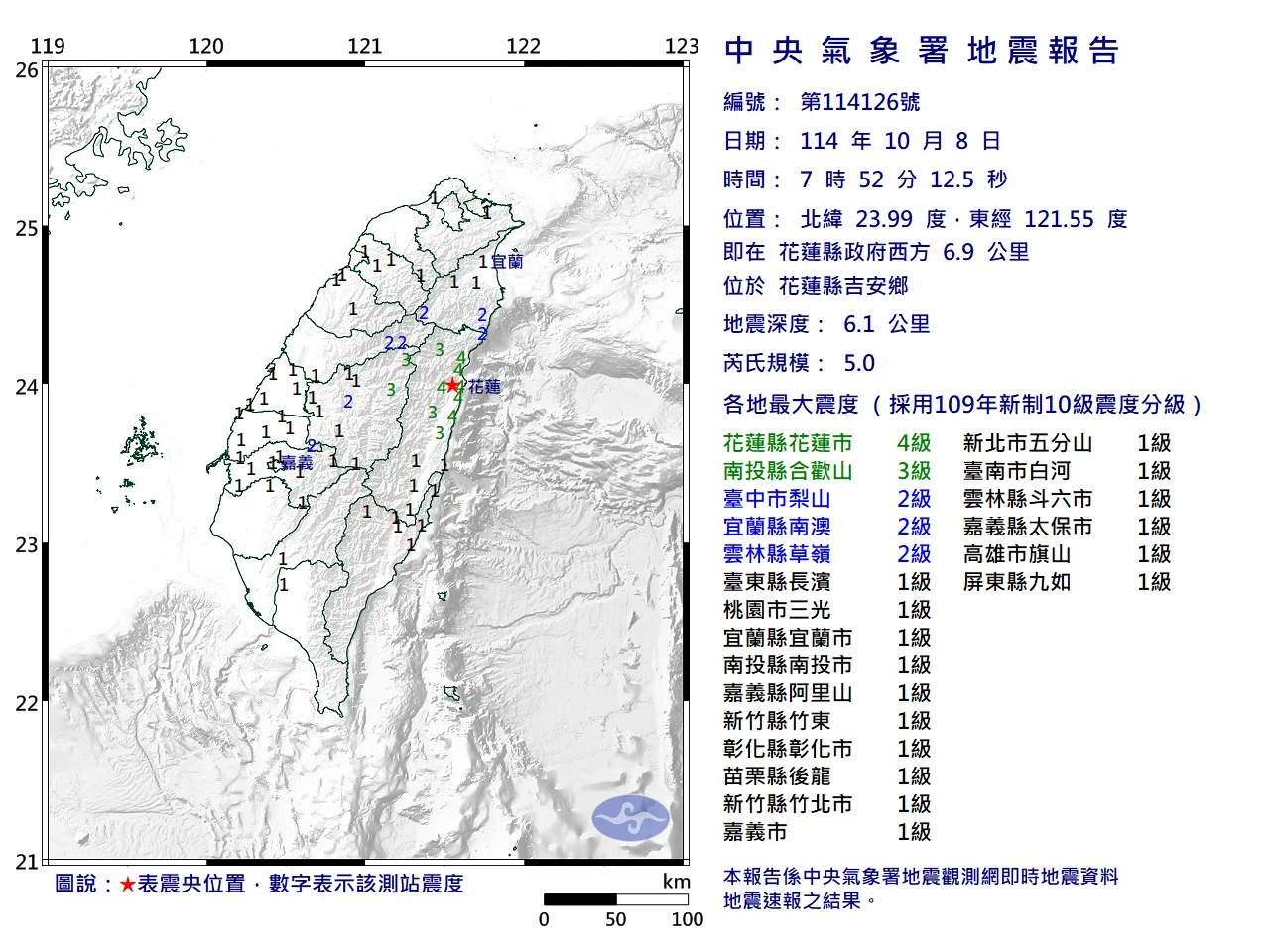 該起地震發生今天上午7點52分,震央位在花蓮縣吉安鄉,芮氏規模5.0,地震深度6.1公里。