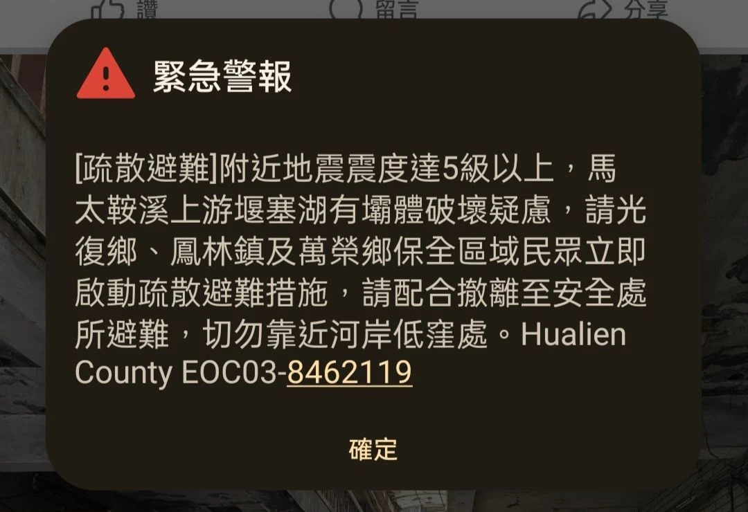 網友在花蓮社群紛紛驚呼,「震很大、花蓮非常有感...光復前線救災人員、請注意安全、安全、安全...大家平安」、「我在火車站,整個火車站裡面晃動起來,嚇死」,還有人表示「在前往光復的路上,地震警報10分鐘內已經響兩次了,嚇死人」,並貼出收到的緊急警報,提醒「附近地震震度達5級以上,馬太鞍溪上游堰塞湖有壩體破壞疑慮,請光復鄉、鳳林鎮及萬榮鄉保全區域民眾立即啟動疏散避難措施,請配合撤離至安全處所避難,切勿靠近河岸低窪處。」