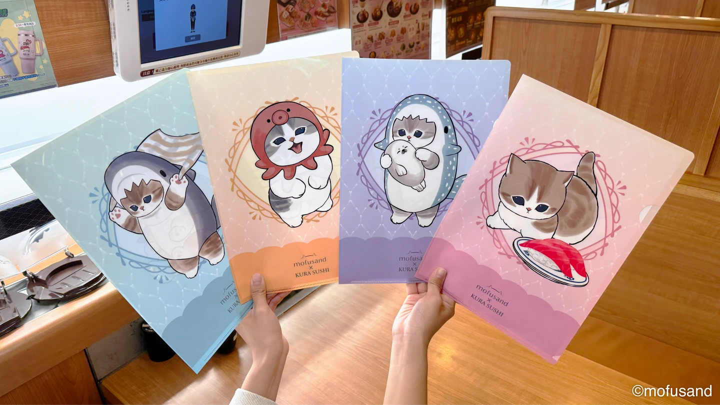 除了扭蛋,藏壽司更祭出「mofusand 貓福珊迪」系列限量滿額贈活動,首波活動自4月8日起跑,凡於全台店舖消費滿1,000元,並追蹤藏壽司官方Facebook及加入LINE好友、綁定會員,即可獲得「mofusand 貓福珊迪」原創透明文件夾乙個,共4款。