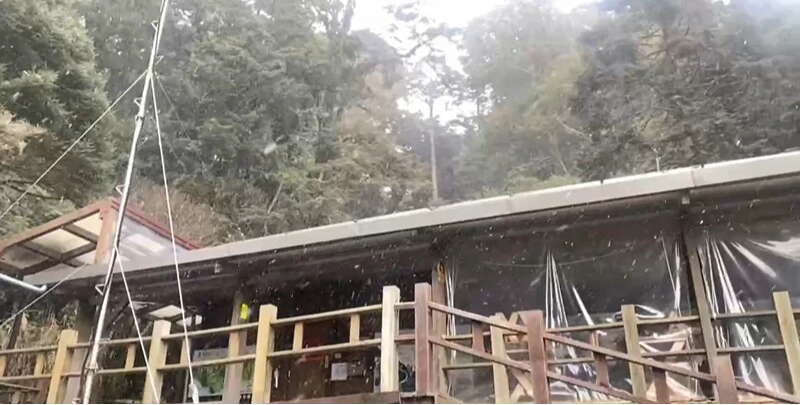 位於玉山國家公園的鹿林天文台也拍到下雪瞬間,高山林區內出現潔白雪花,一片片落下成最美瞬間。