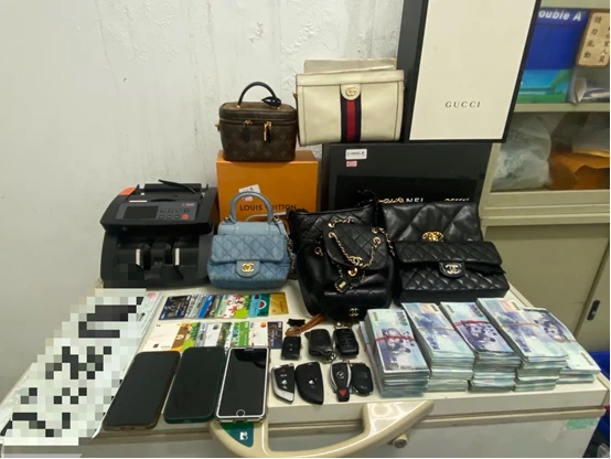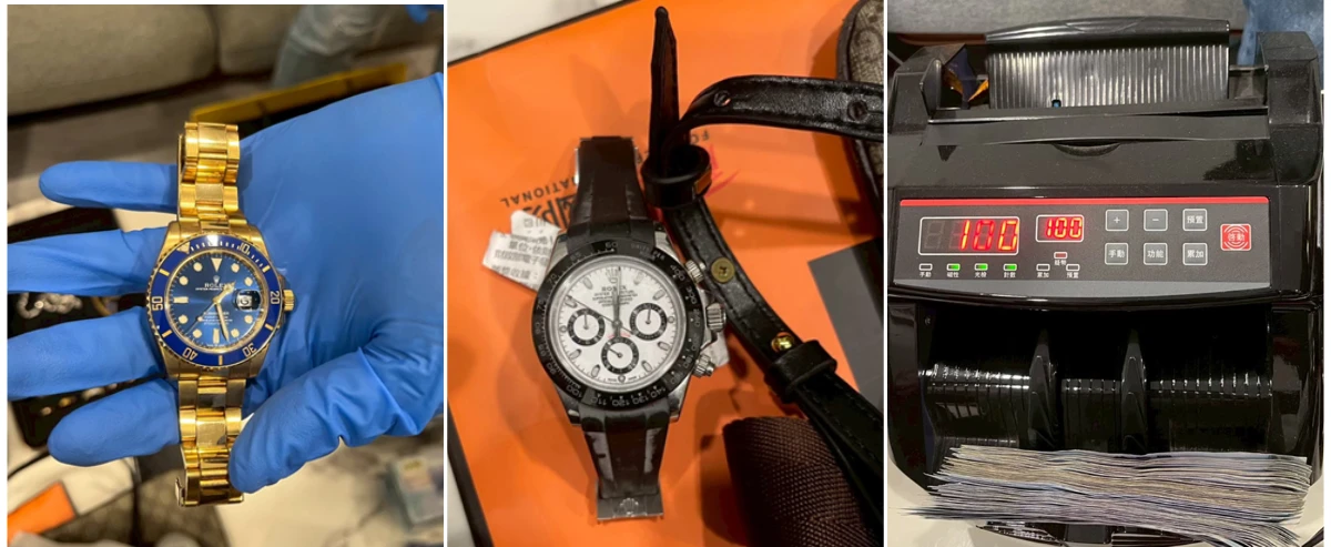 承辦警官說,查扣證物包括市價超過2000萬元的勞斯萊斯幻影名車1輛、市價超過1000萬元的賓士GT跑車1輛、精品鞋3雙、勞力士手錶2只、手機9支、現金新台幣89萬元、筆電2台、電腦主機1台、點鈔機及監視器主機各1台,以及空氣槍、彈丸及瓦斯鋼瓶等。其中被查扣的賓士GT跑車與勞斯萊斯幻影,曾出現在吳男拍攝的影片中。