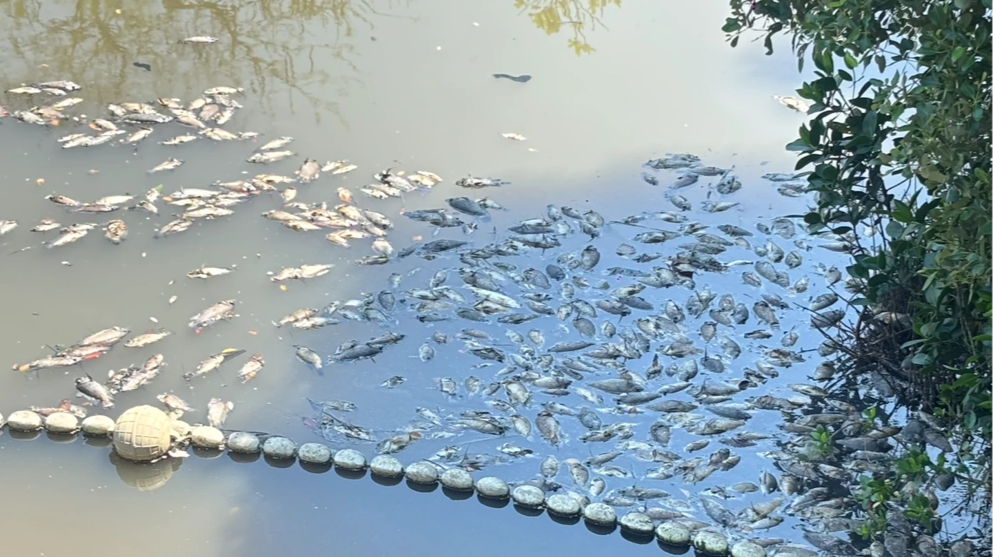 讀者陳先生對《知新聞》表示,他平時在公園跑步,昨晚即聞到異味,今天上午再查看時發現水面滿是魚屍,「前幾天還沒有,應該是昨天發生」,味道相當刺鼻,只要經過同盟路就能聞到惡臭。