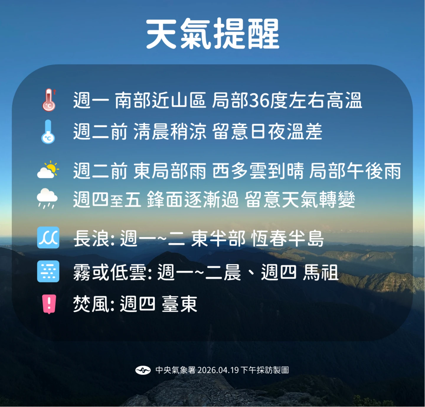 澎湖晴時多雲氣溫23至28°C,金門20至26°C,馬祖18至24°C。東半部沿海及恆春半島易有長浪,海邊活動注意安全;馬祖易有低雲或局部霧影響能見度,往返離島確認航班資訊。