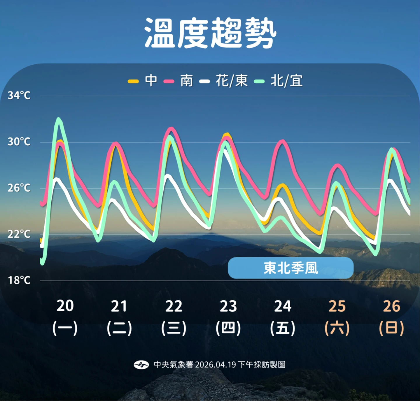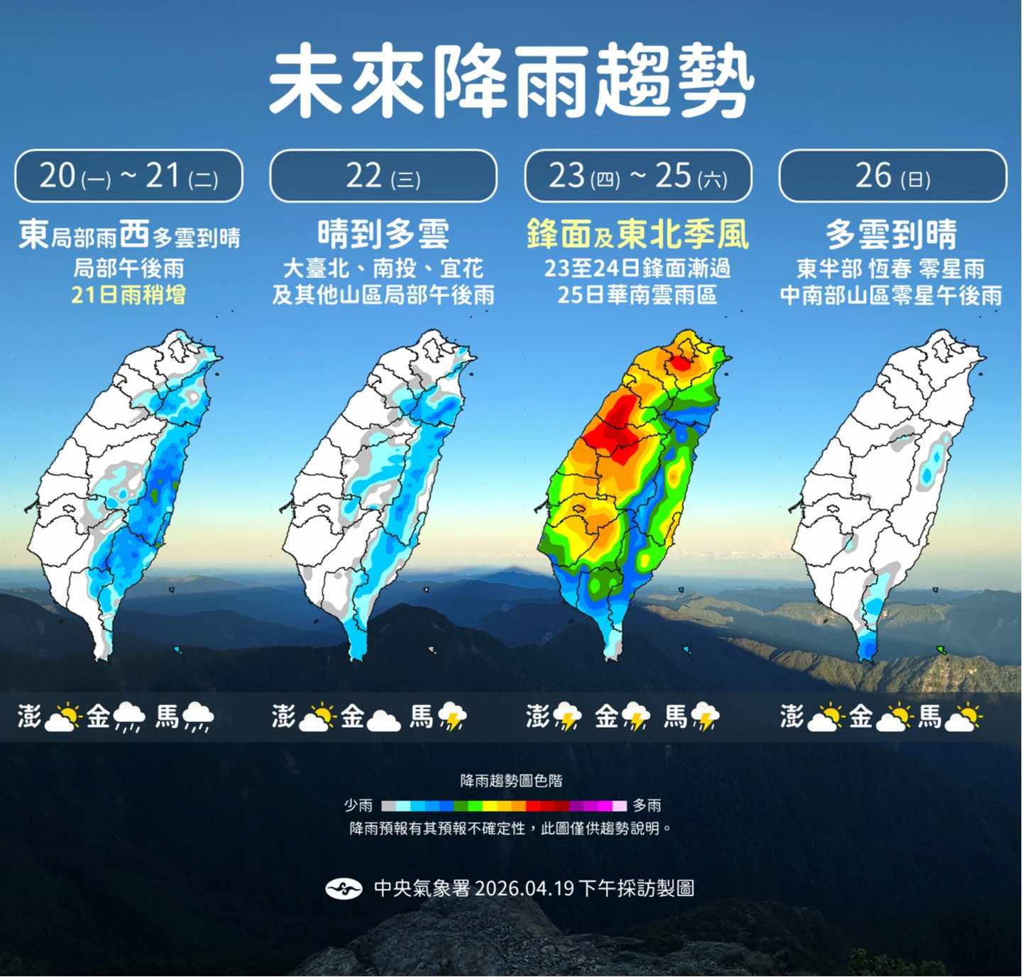下周日(26日)東北季風減弱、水氣漸少,各地降雨趨緩,大多回復多雲到晴,僅東半部及恆春半島有零星短暫陣雨,氣溫也將逐步回升。