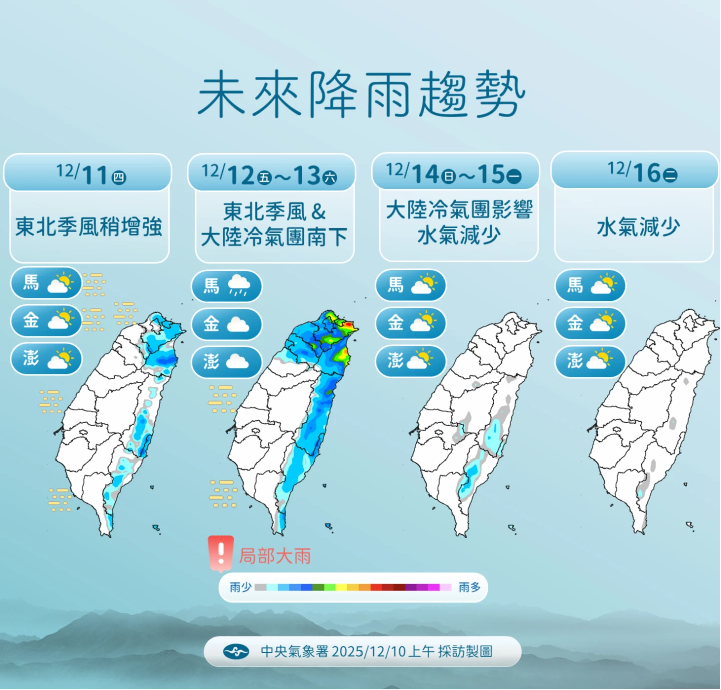 明起到周六(13日)白天,東北季風持續影響,北部及東北部天氣偏涼,其他地區清晨與夜晚偏涼。明天水氣較多,基隆北海岸、東北部及大台北山區有雨且可能有局部大雨;桃園以北、東部、東南部與恆春半島亦有短暫雨。周六仍有局部降雨,其中迎風面的雨勢較明顯,但其他地區維持多雲到晴。