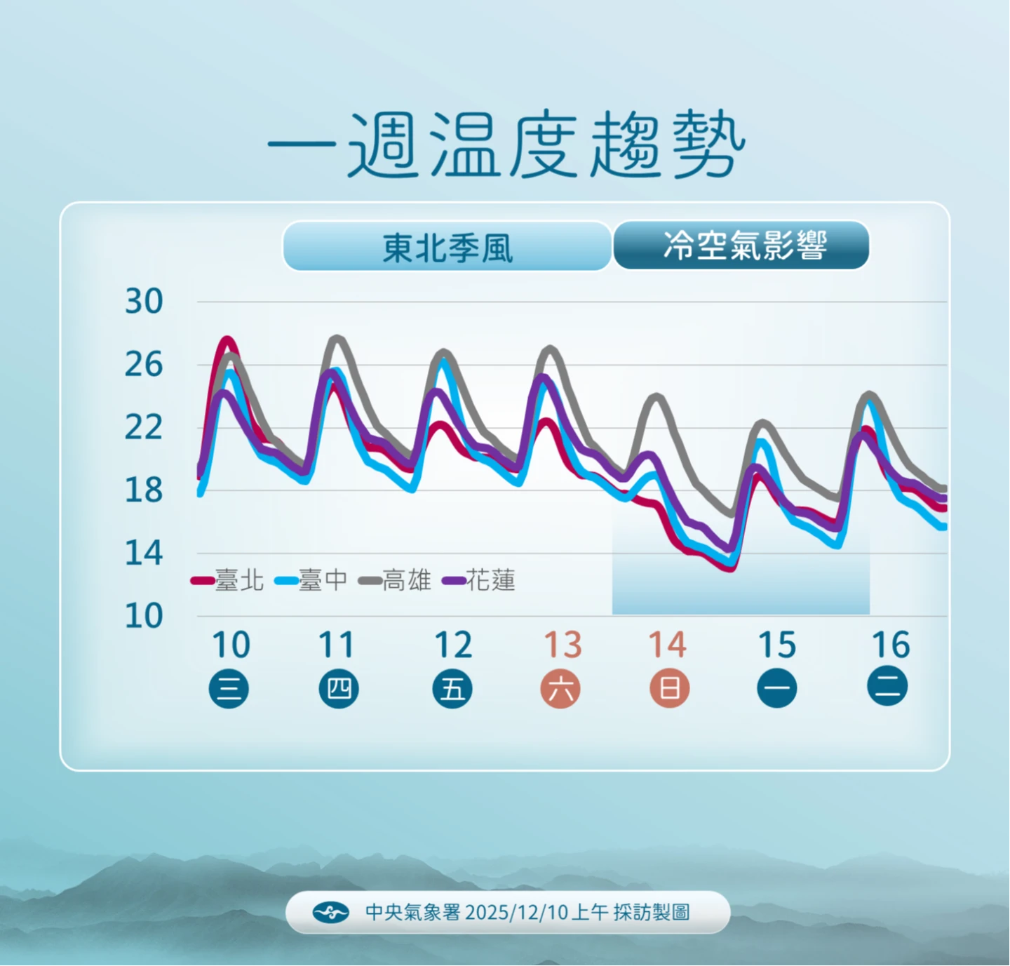 下周日(12/14)、周一(12/15)全台轉為偏冷,僅基隆北海岸、大台北山區、東半部及恆春半島零星短暫雨,水氣減少後輻射冷卻明顯,中部以北、宜花及金門、馬祖低溫可降至12~15°C,南部、台東及澎湖約14~17°C,高海拔道路須留意結冰風險。