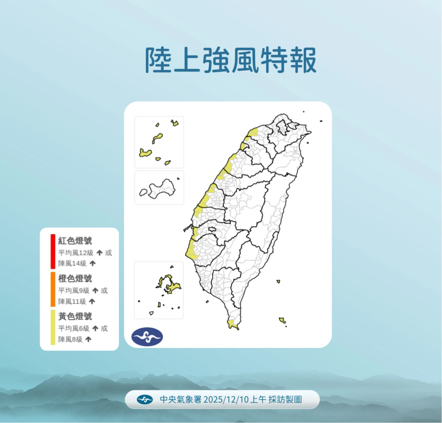 隨東北風逐漸增強,台南以北、基隆北海岸、台東沿海、恆春半島及離島有6級以上平均風或8級以上陣風,東半部與恆春半島沿海也有長浪。