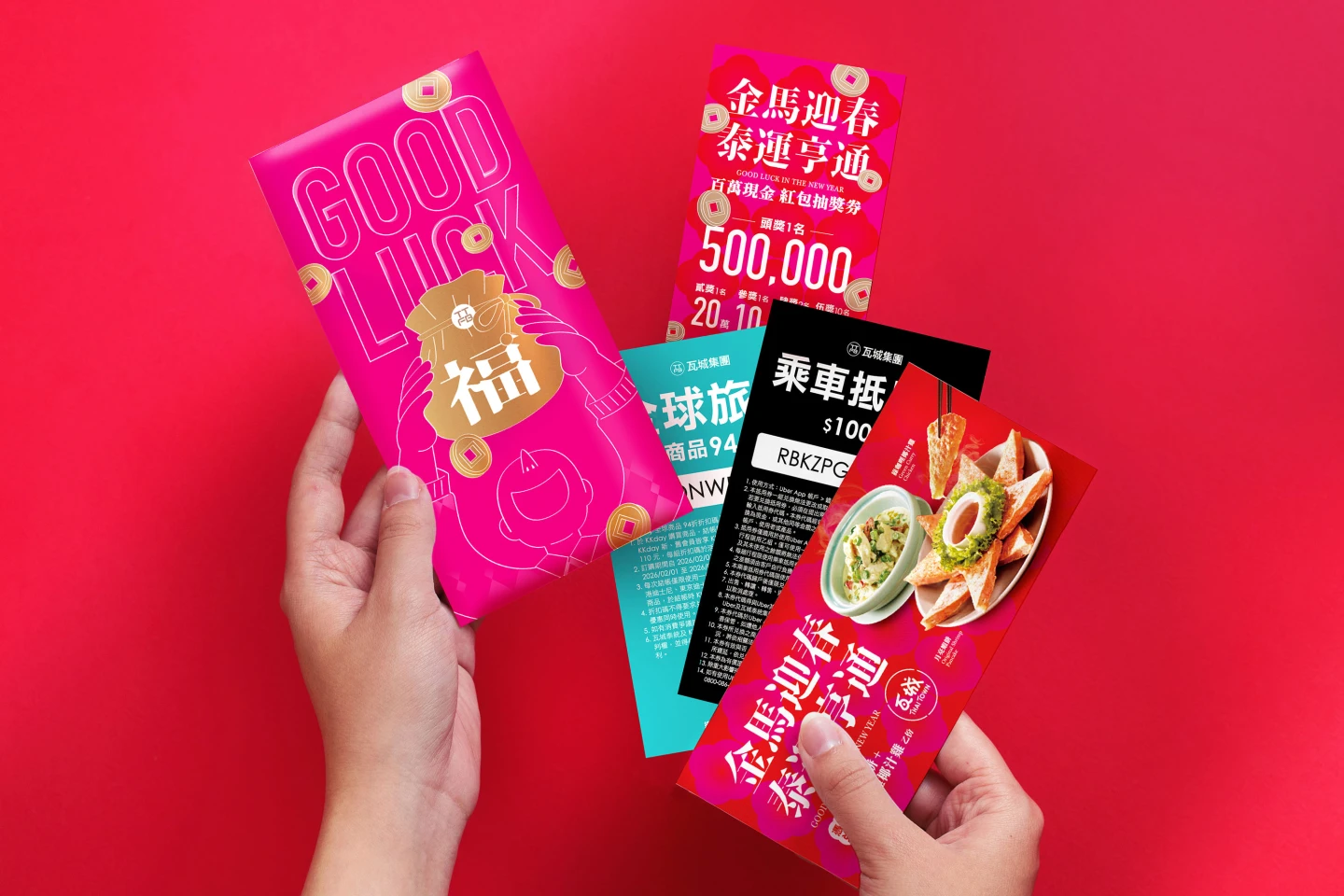 瓦城集團今年首度於全品牌門市推出超值「2026金馬迎春泰運亨通福袋」,自2月12日至3月8日限量販售,售價588元。福袋不僅內含價值700元以上的品牌明星招牌餐點兌換券,還有Uber乘車優惠序號及抵用券、KKday旅遊優惠券、賀歲強檔《功夫》電影早場優惠券等,以及現金紅包抽獎券,頭獎高達50萬元現金,總獎金高達100萬。