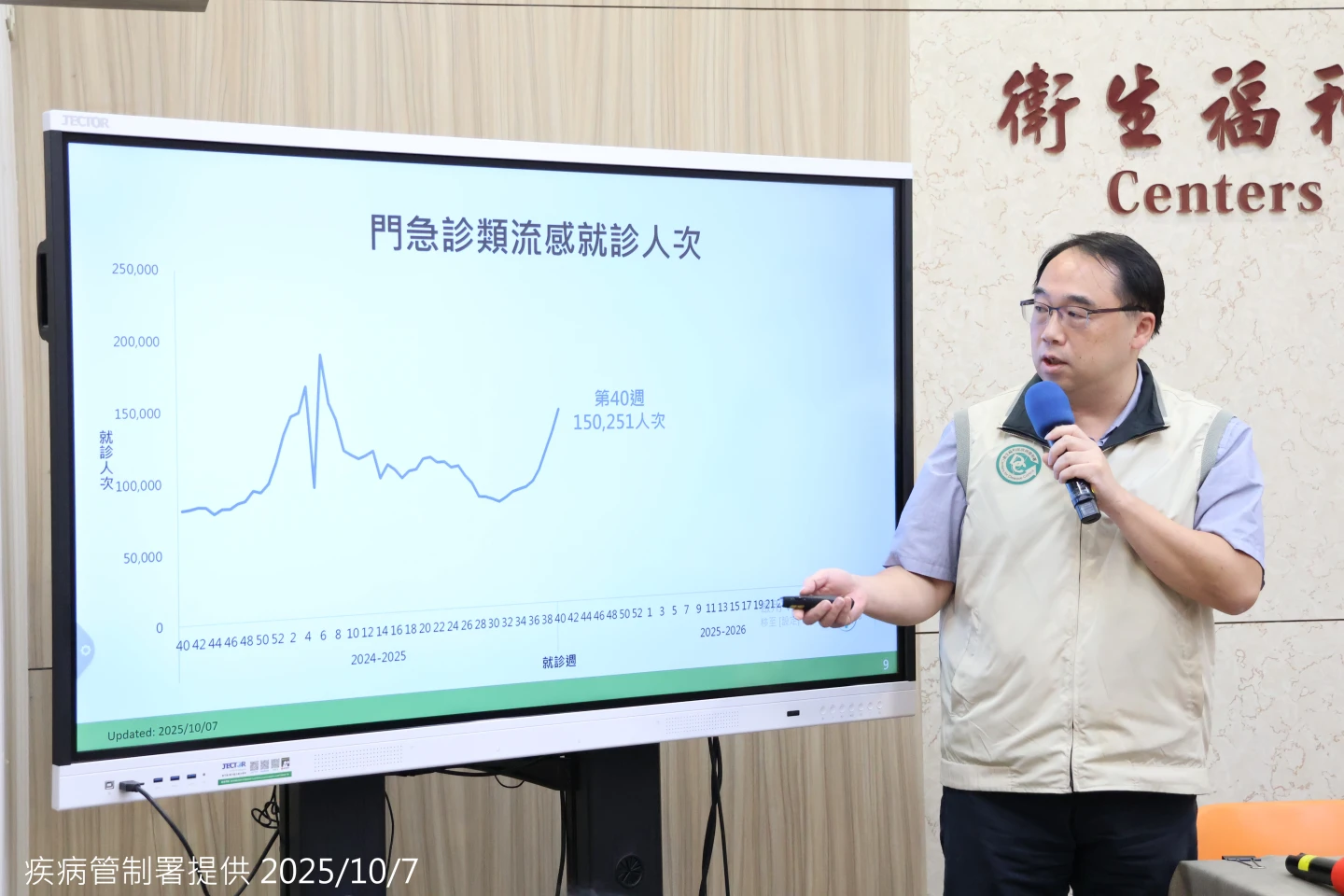 疾管署最新統計,第40周(9/28-10/4)類流感門急診就診計150,251人次,較前一周上升13.5%,近期呈上升趨勢,且處流感流行期;依實驗室監測資料顯示,目前社區中流行之呼吸道病原體以流感病毒為主,其中以A型H3N2為多,其次為A型H1N1及B型,持續觀察疫情變化。