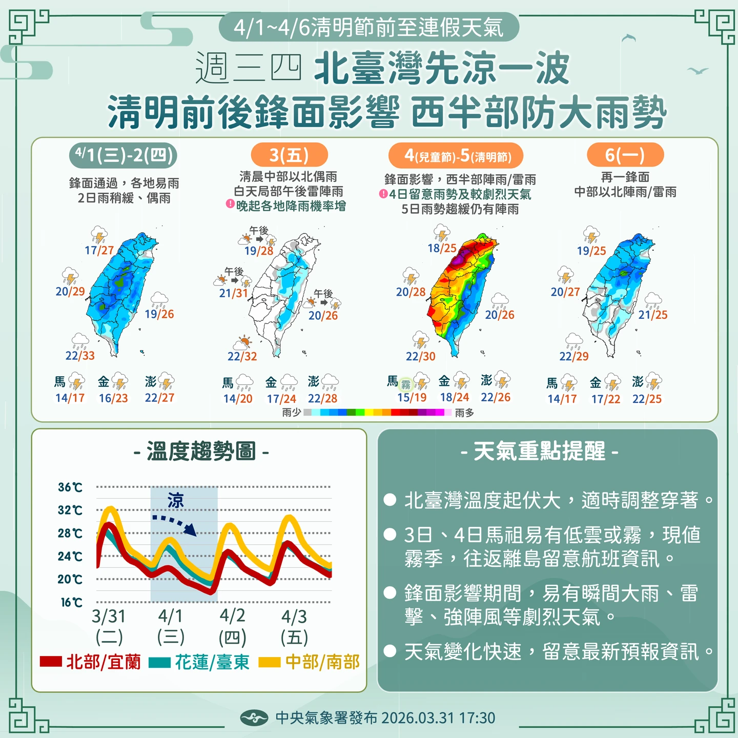 至於清明連假天氣,預估將有另一波更強的鋒面來襲。4月3日晚間起鋒面就會逐漸接近,並在4日、5日兩天發揮影響力。這波鋒面不僅影響範圍較廣,雨勢也相對較強,全台都將轉為有雨的天氣型態。其中,中部以北及東北部地區將有陣雨或雷雨,特別提醒在4日當天需防範局部大雨的發生;直到5日水氣才會稍稍減少,中部以北、東半部地區及南部山區仍有局部短暫陣雨。