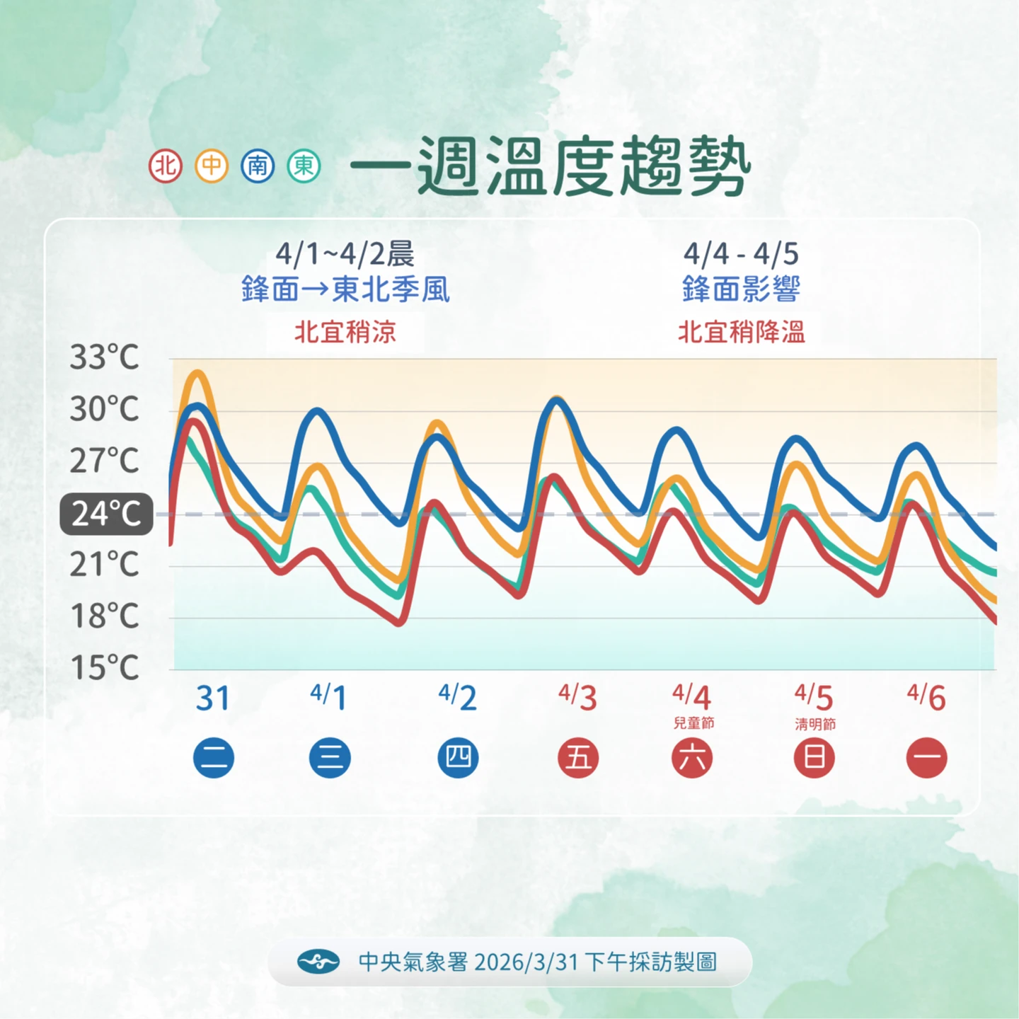 氣溫方面,受到鋒面影響及東北季風增強,明日至4月2日清晨天氣偏涼冷,明日白天北部高溫約攝氏21至22度,中南部則落在24至30度之間;明晚至2日清晨,北部低溫將下探17至19度。