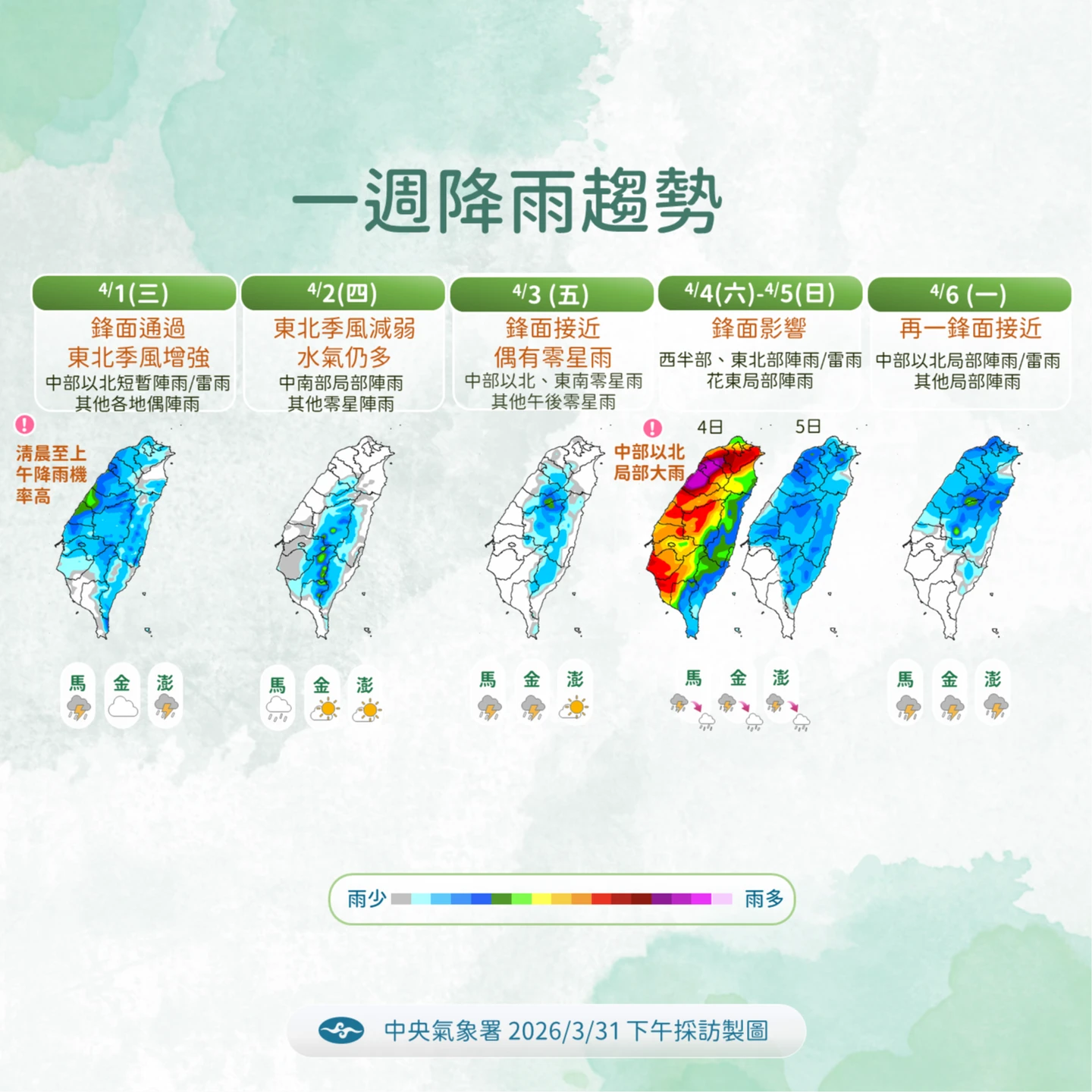 【記者陳力維/綜合報導】未來一周台灣天氣變化劇烈,馬上要迎來3波鋒面接力影響,全台各地易有陣雨或雷雨發生。首波鋒面將於明日率先報到,帶來全台降雨並伴隨氣溫下降;緊接著在清明連假期間,第二波影響範圍更廣、雨勢更強的鋒面將接續襲台,尤其4月4日周六,中部以北地區需嚴防局部大雨。連假尾聲還有第三波鋒面接近,提醒民眾未來一周外出務必攜帶雨具,並留意氣溫變化與航班交通資訊。