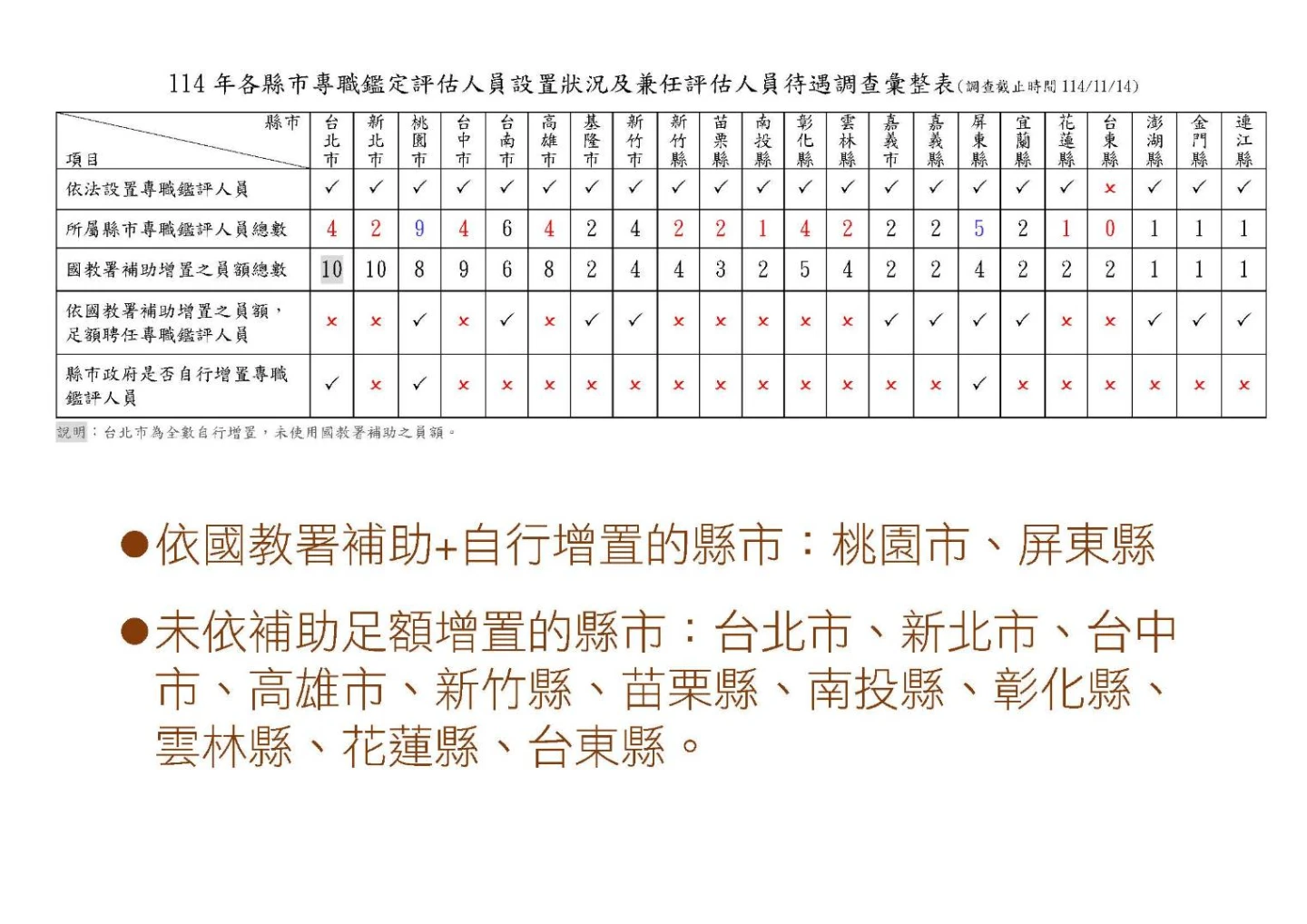 鍾正信則說,各縣市應重視專職鑑評員額問題,並適時增聘,另外,國教暑補助增置專職鑑評員額只到今年為止,明年起若未補助,恐讓問題更加惡化,呼籲逐步增加專職鑑評人力。