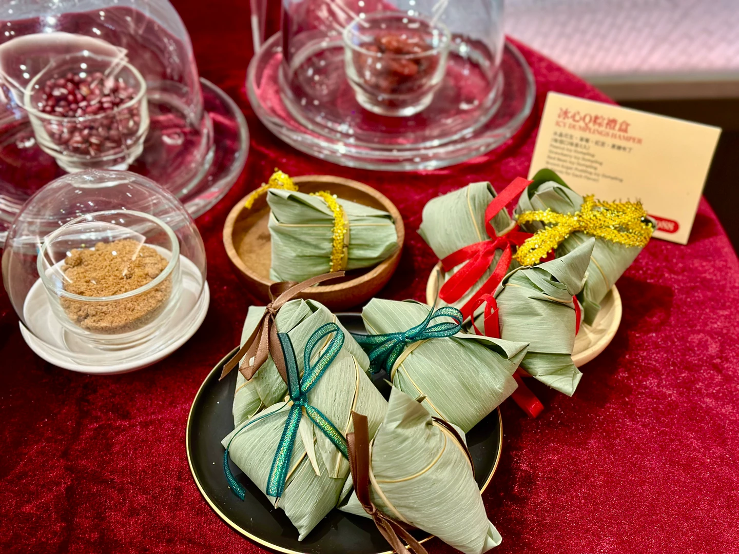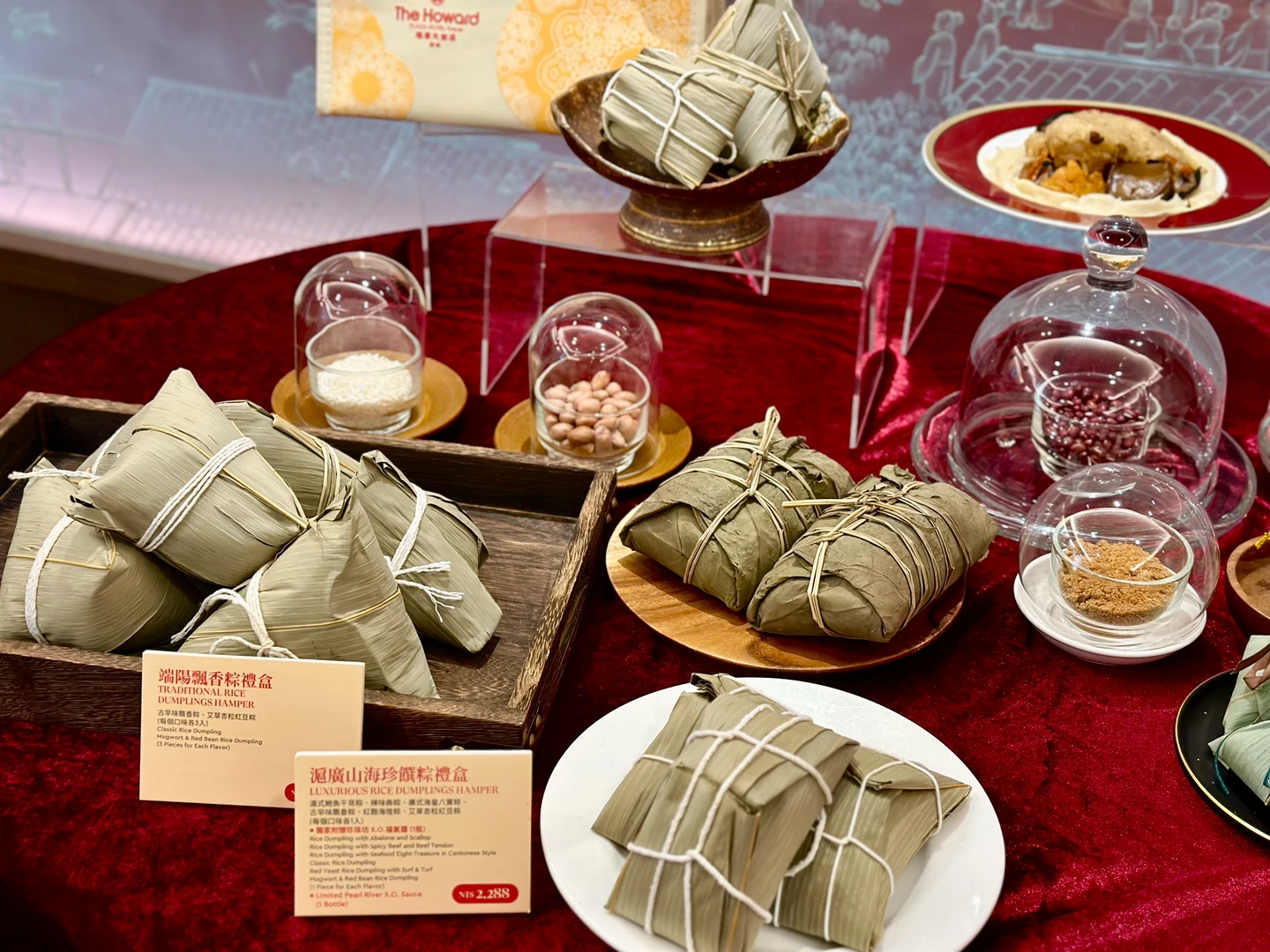 另一款「端陽飄香粽禮」內含2款經典粽子,古早味飄香粽、艾草杏粒紅豆粽各3入,售價1,388元。彩虹座自助餐廳則推出「冰心Q粽禮袋1,088元」和「煙燻龍眼鳳梨酥490元」、「手工餅乾460元」端午禮盒。