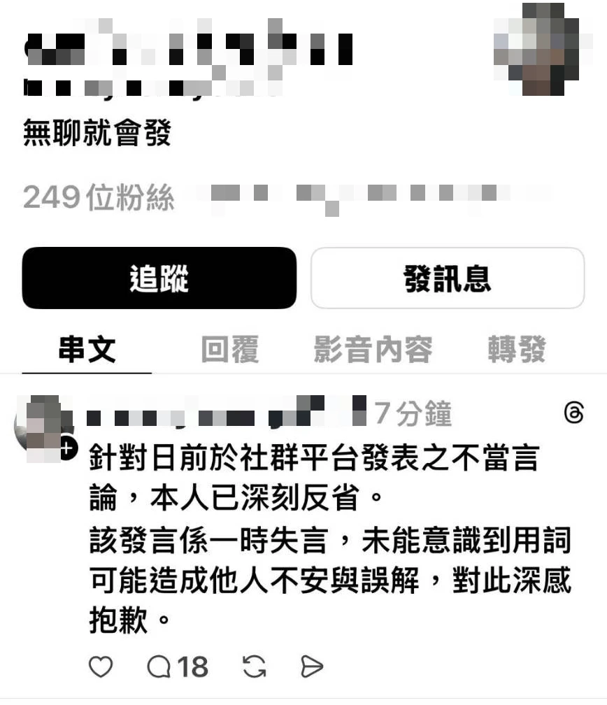 限動一出彭男立即遭網友留言撻伐,彭男見事態嚴重,立即下架此則限動,並貼出60字道歉說,「針對日前於社群平台發表之不當行為,本人已深切反省。該發言係一時失言,未能意識到用詞可能造成他人不安與誤解,對此深感抱歉」。