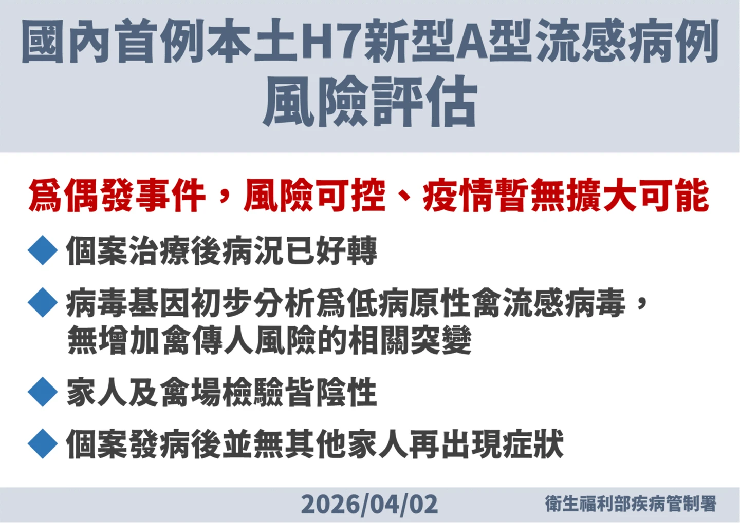 羅一鈞說,基因分析顯示為低病原性禽流感病毒,未有增加禽傳人風險相關突變,仍為一般禽源病毒,個案接觸者都檢驗陰性,初步評估此案為偶發事件,沒有人傳人跡象,評估風險可控、疫情暫無擴大之虞。