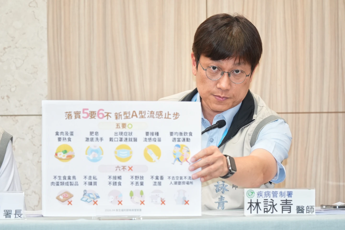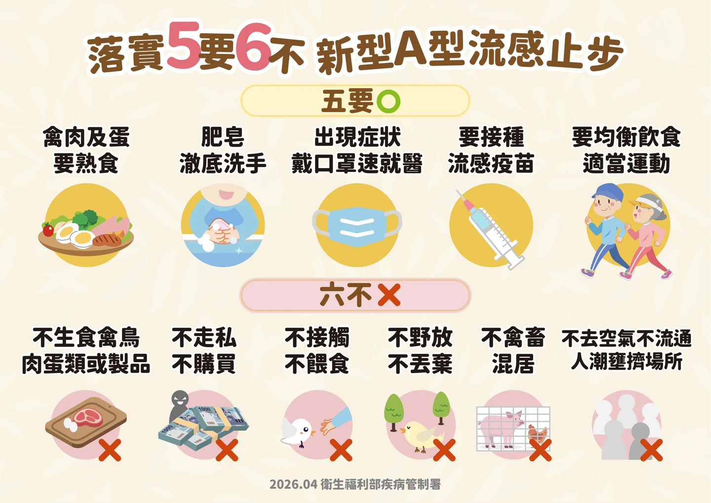 疾管署提醒,為降低新型A型流感感染風險,禽畜養殖相關工作人員在作業過程中應落實自我防護,於工作結束後落實清消。若出現急性呼吸道感染或結膜炎症狀,應儘速就醫並主動告知醫療人員其職業與動物接觸史,以利早期診斷。民眾則建議於日常生活中落實「5要6不」防疫原則: