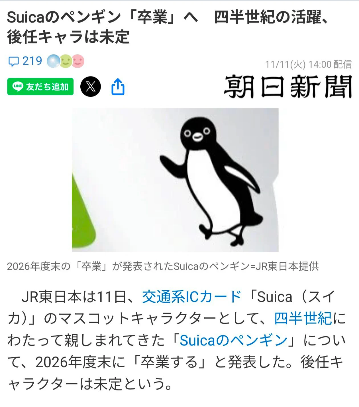 旅遊達人「林氏璧」在臉書粉專「日本自助旅遊中毒者」發文驚嘆:「不會吧!Suica 西瓜企鵝竟然要畢業了!JR東日本!今天是雙11,又不是愚人節,你要確定欸...企鵝你又不會老,又不是偶像團體,你是在學人家畢什麼業啦~~~」。