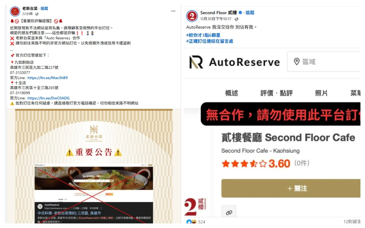 貳樓、老新台菜、咖央、芝生食堂、八條壽司、甜蒔吇舒芙蕾、魚貫鐵板燒、首爾花漾豬等多家餐廳都在臉書發布聲明,強調沒有跟「AutoReserve」訂位平台合作,避免更多消費者受害。