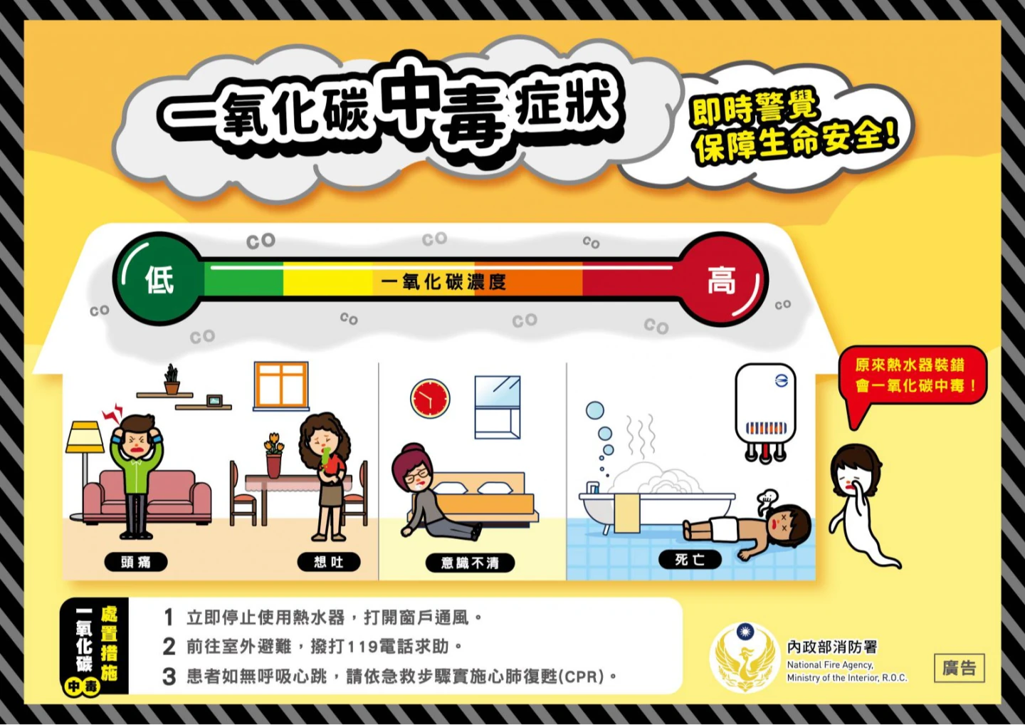 消防署提醒,一氧化碳中毒症狀及處置措施,人體吸入一氧化碳後,經常會有頭痛、噁心、暈眩、昏迷等症狀,甚至導致死亡,如果使用燃氣設備(如燃氣熱水器)時,有上述症狀發生,要警覺可能是一氧化碳中毒,請立即停止使用燃氣設備,並打開通往室外的門窗通風。