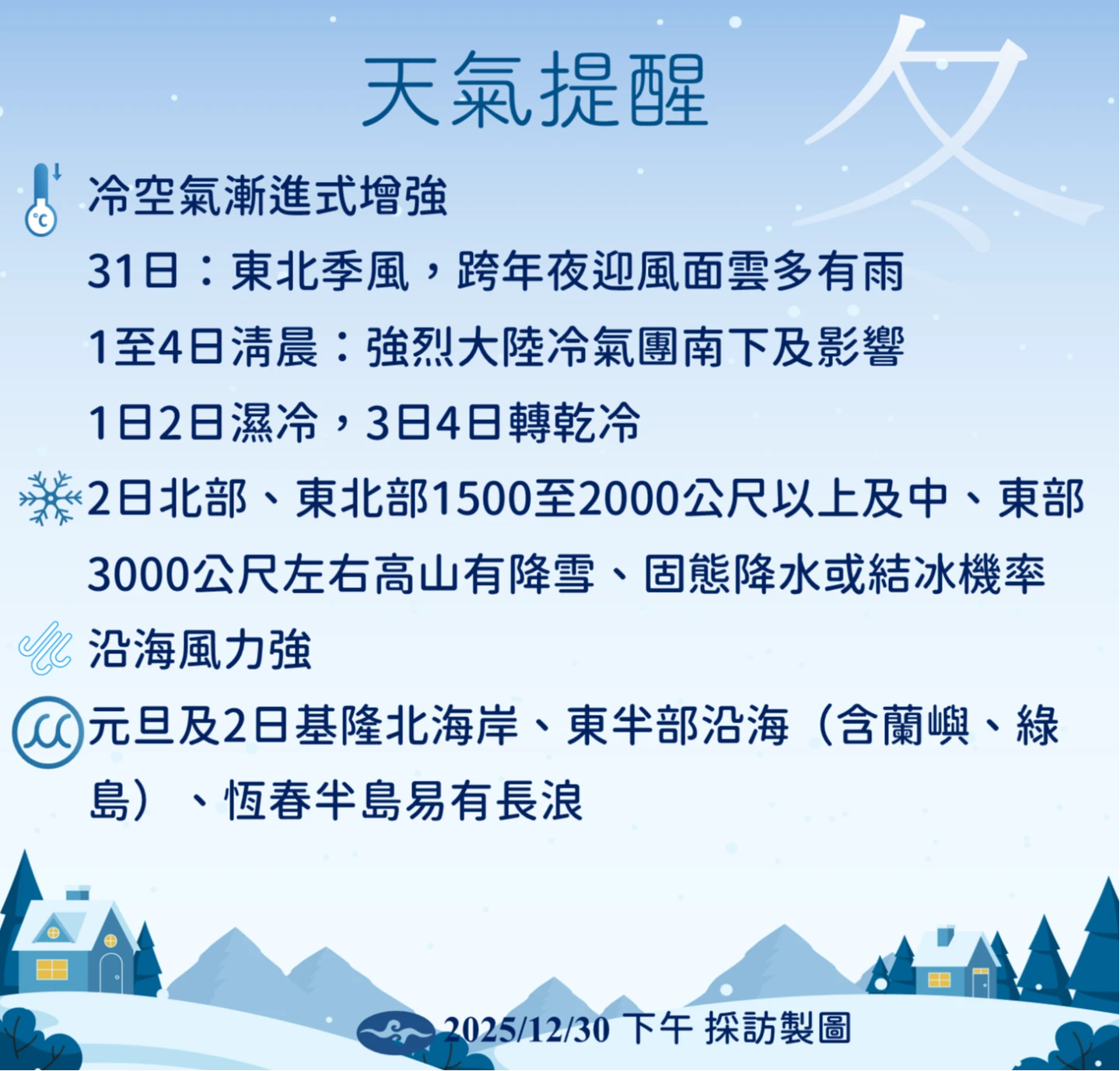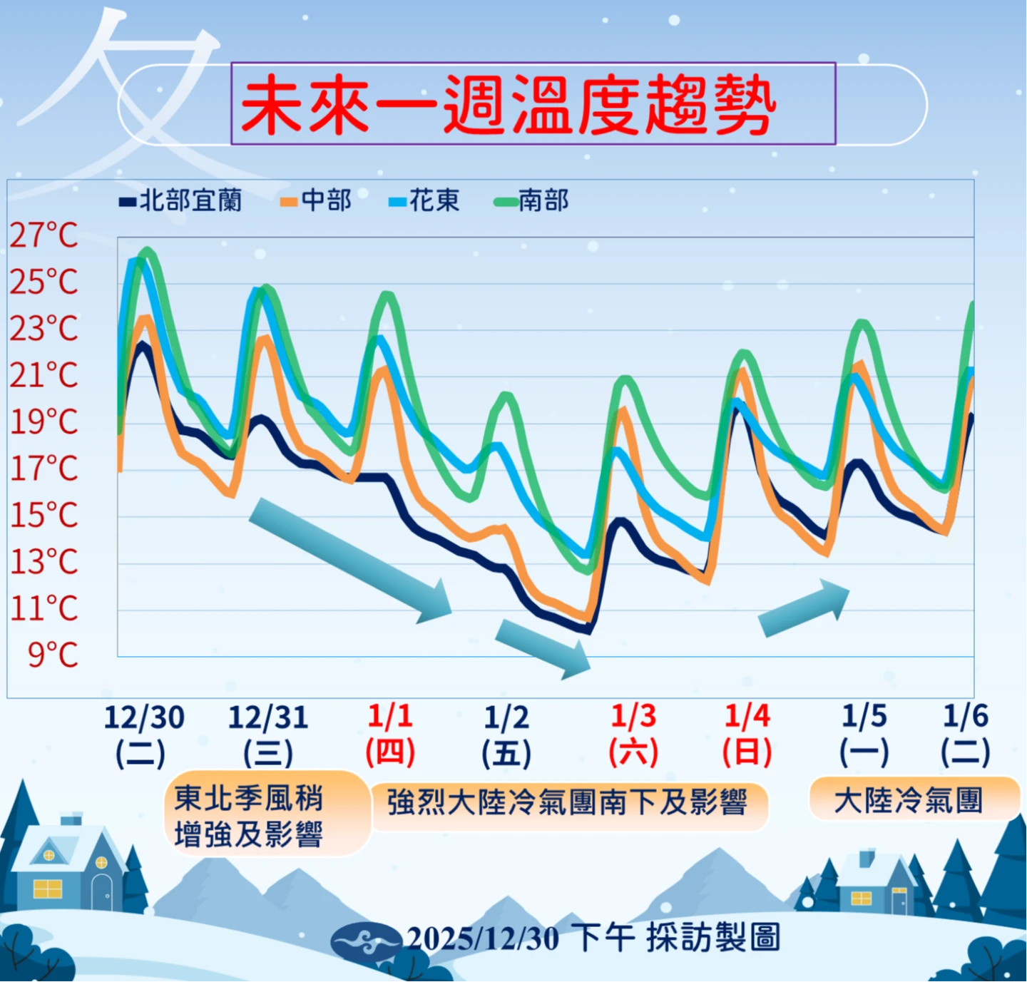 元旦(1月1日)清晨各地氣溫仍涼,北部約16至17°C。白天起強烈大陸冷氣團南下,氣溫將呈現「溜滑梯」式下降,預估中部以北及東北部晚上將降至14°C左右,其他地區也會降至16至19°C。