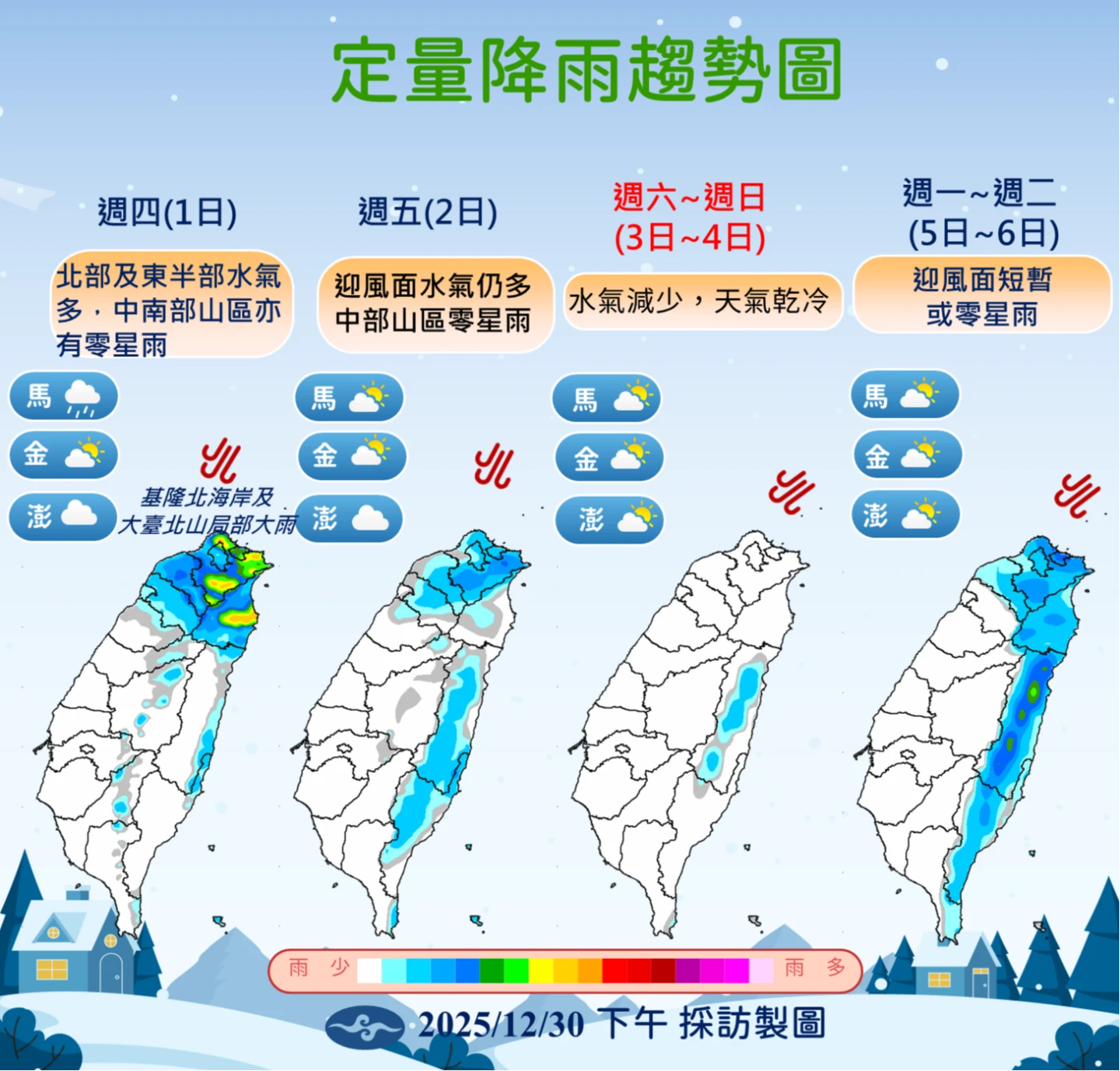 這波冷氣團持續影響至下周日(4日),氣象署指出,周五為濕冷天氣,北部、東半部有雨,高山有降雪的可能;周末轉為乾冷,雖然天氣轉好,僅剩迎風面有零星雨,但受輻射冷卻效應影響,早晚氣溫極低,新竹以南日夜溫差擴大。