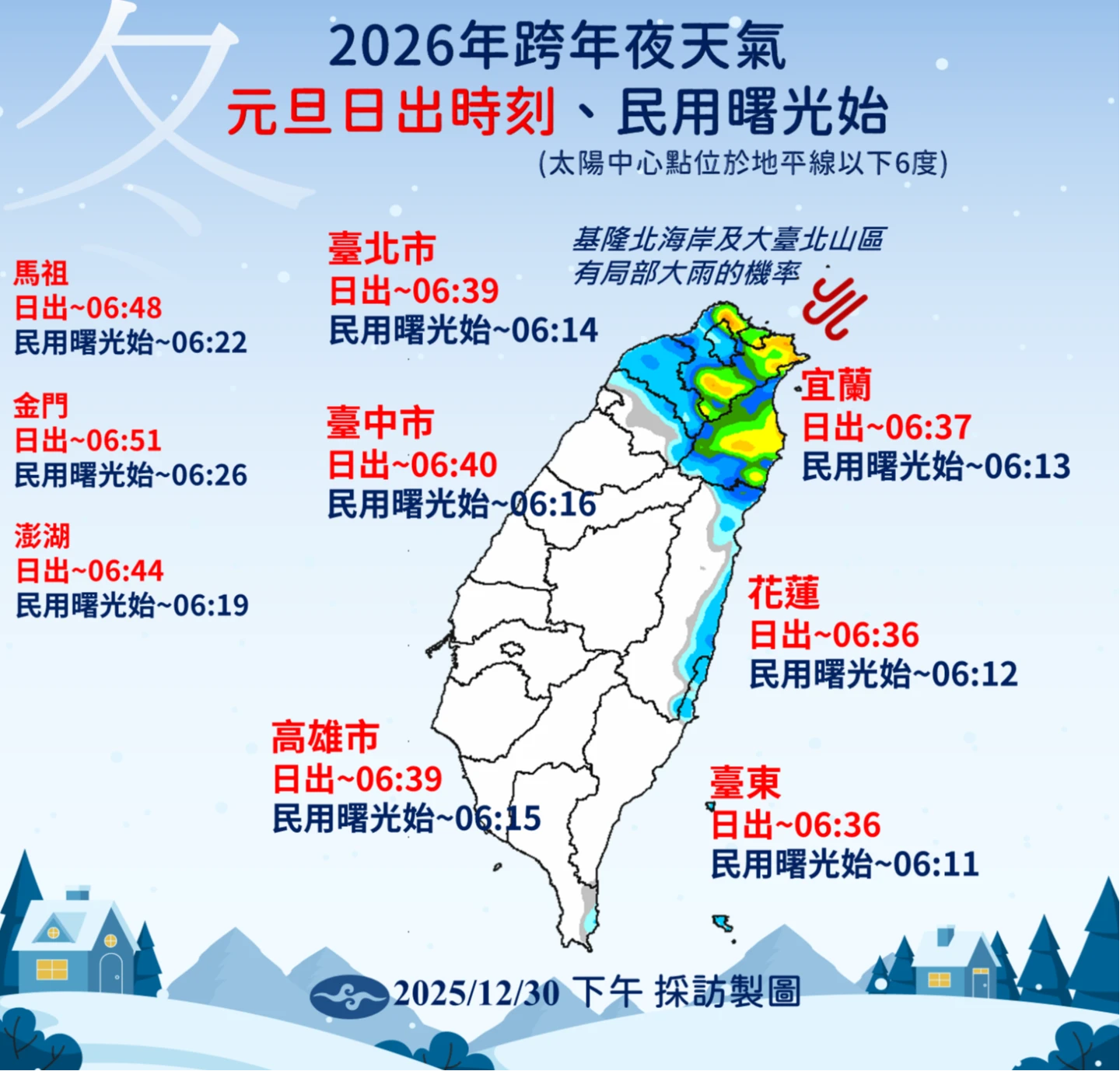 氣象署說,元旦當天水氣仍多,基隆北海岸及大台北山區恐有大雨,北部、東半部及恆春半島有局部短暫雨,若想在北部看到曙光機率較低,中南部及金門、澎湖看見曙光的機率相對較高。
